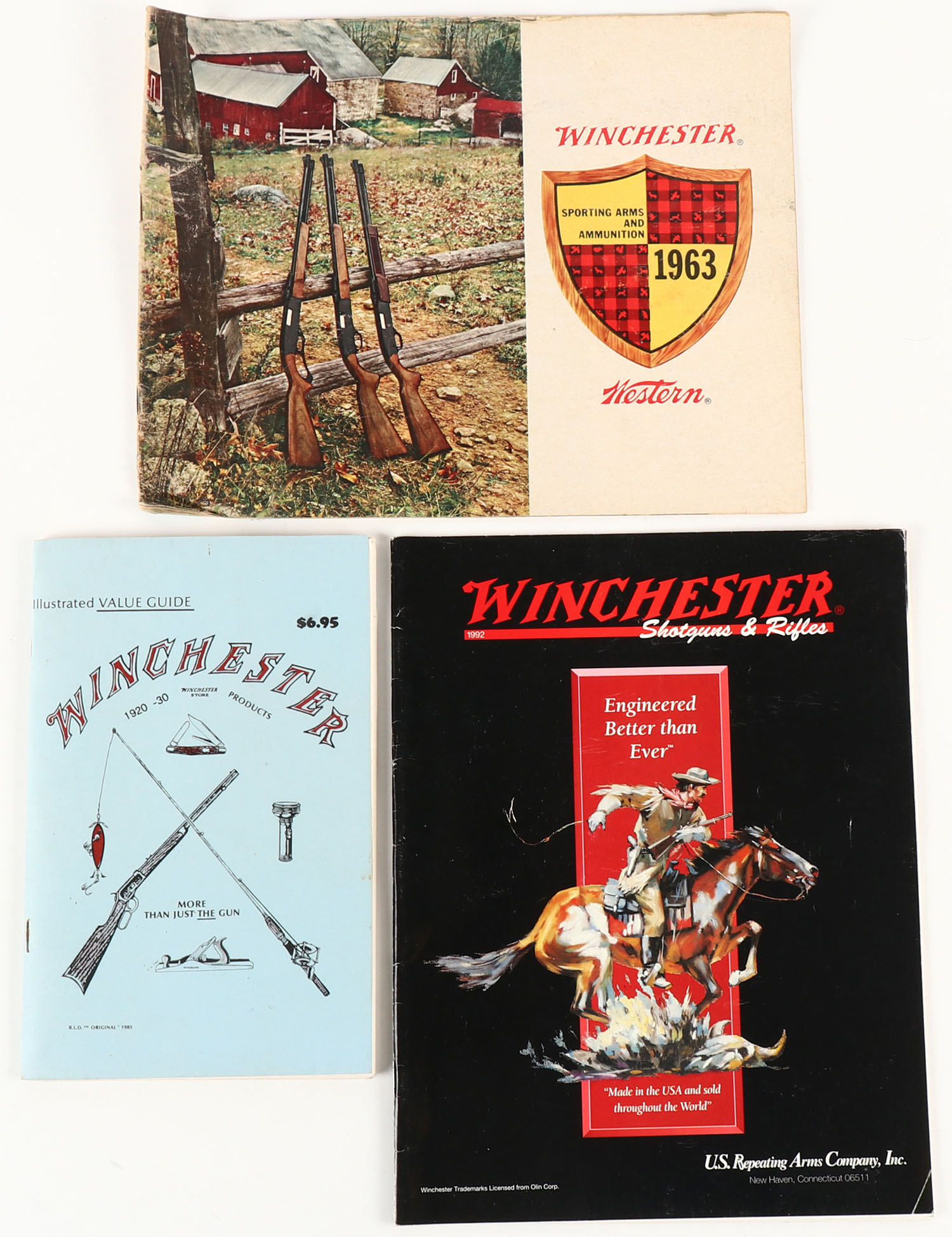 Lot of 3. Winchester Store Products, 1920-30, Value Guide, 1985, 62 pages, b/w images, pages clean binding tight, paper cover very good with some soiling, (2)Winchester 1963 catalog, 31 pages, pages clean, color and b/w images, paper cover good ++ with some wear and soiling, (3)Winchester 1992 catalog, 51 pages, pages clean, color images, paper cover very good with some wear and soiling. Grade: Very Good - Value: 2 to 30