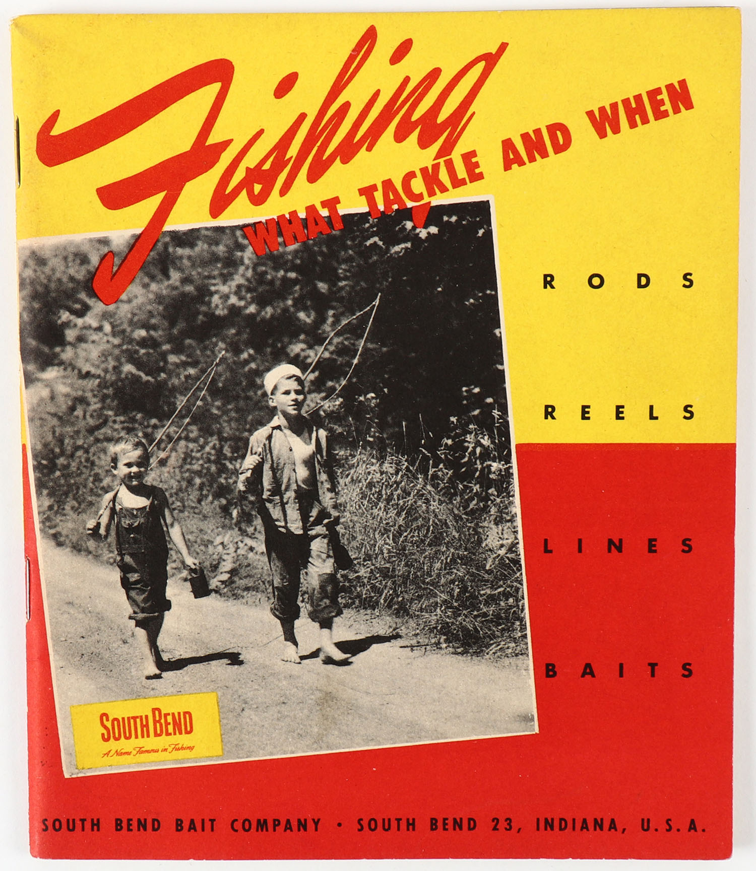 1948 South Bend Fishing Tackle Catalog, full line catalog with 48 pages of items pictured, 5'' x 6'', great color cover front & back, pictures rods, reels & all lures, many are in color, solid condition. Grade: Excellent + - Value: 20 to 60