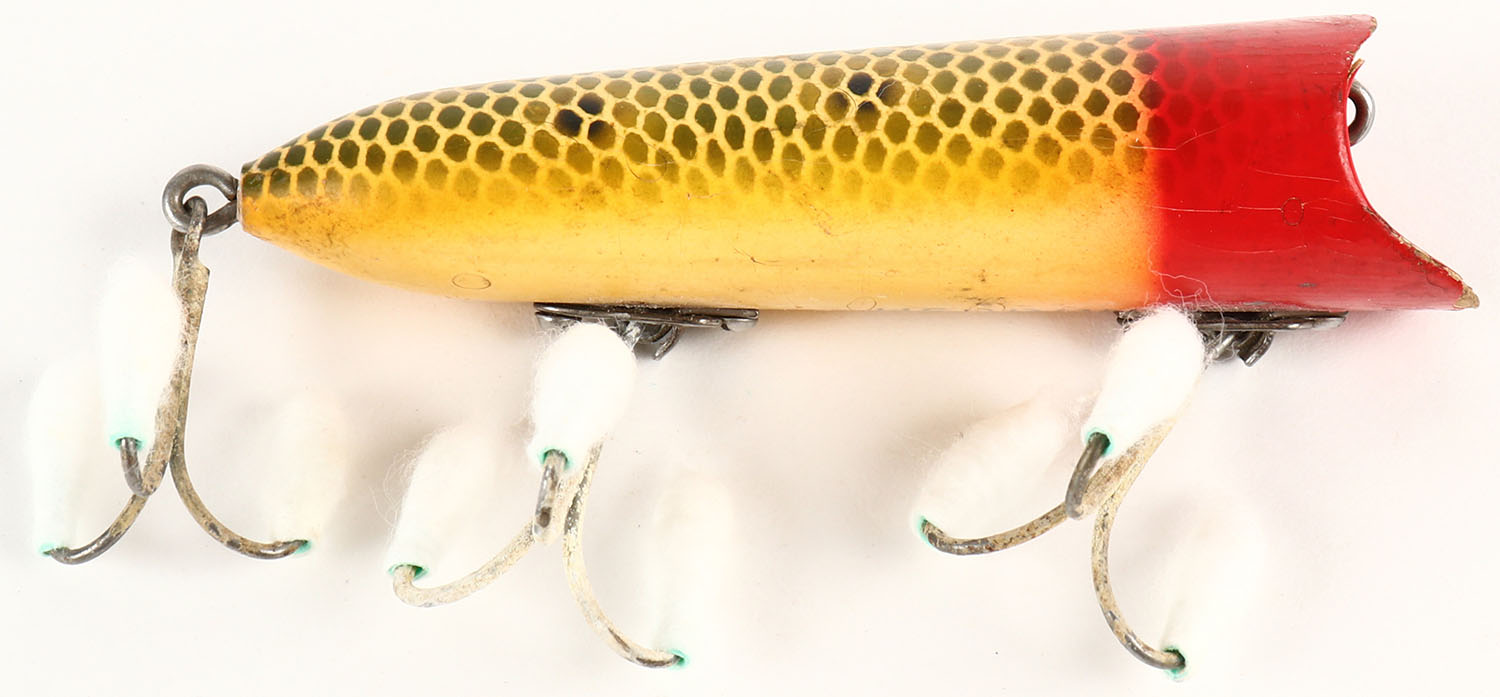 RARE Heddon Lucky 13, wood lure, no eyes, Red head frog scale, 3 hooks, belly marked, 2pc hdw, 3 1/2''. Grade: Excellent - Value: 100 to 150