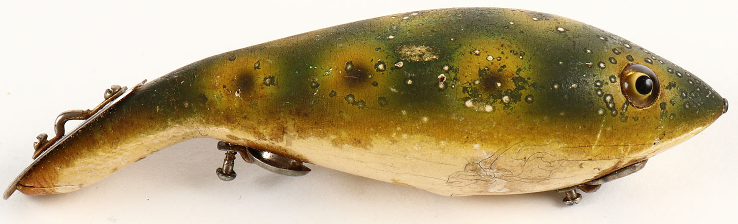 Heddon Dowagiac Tadpolly, 2 hook wood lure (no hooks included), Frog finish, has glass eyes, L-rig, marked metal lip, show wear to paint, 4''. Grade: Very Good + - Value: 10 to 40
