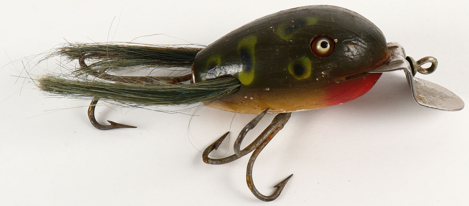 Creek Chub Dingbat, wood lure, GE, Frog pattern with green hair, 2 hooks, marked metal lip, Cup rig, 2 1/4''. Grade: Very Good ++ - Value: 10 to 40