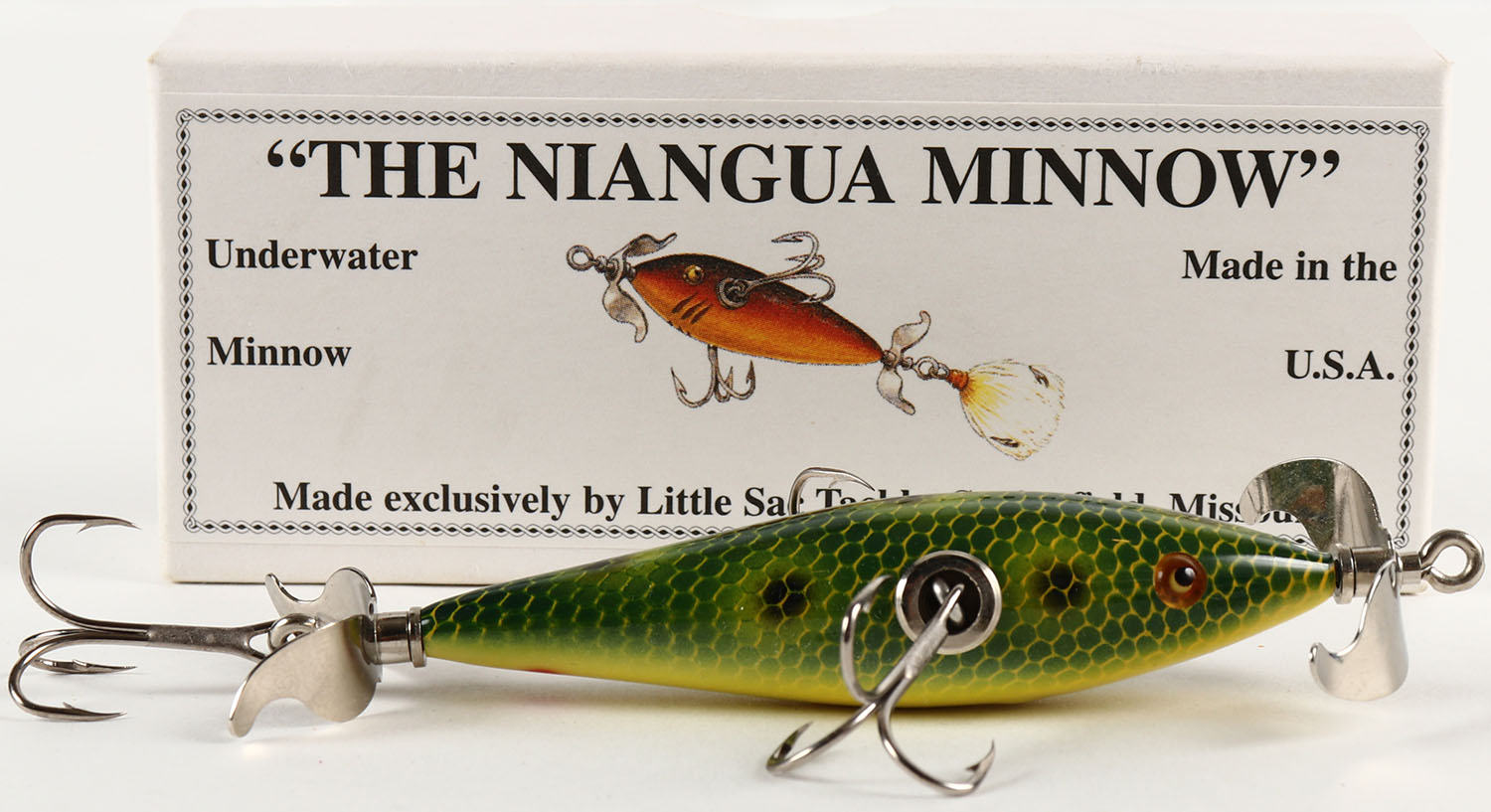 Little Sac Tackle Niangua Minnow in the original box, Frog Scale, 2003, 3 hook lure. Grade: MINT - Value: 10 to 40