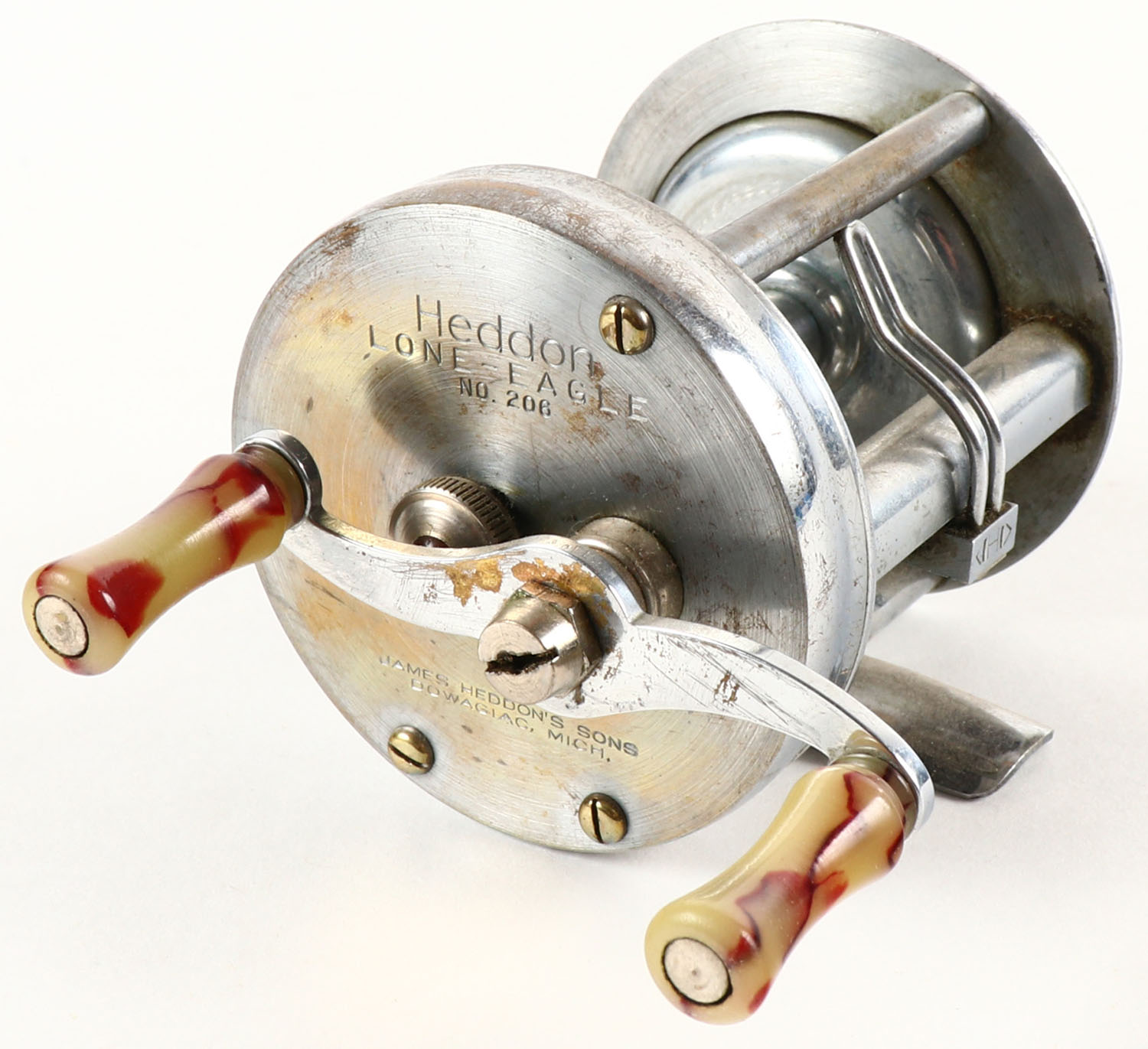 James Heddon & Sons, Lone Eagle No. 206, Bait Casting level wind reel, dual handle, strong click, works well. Grade: Excellent - Value: 10 to 40