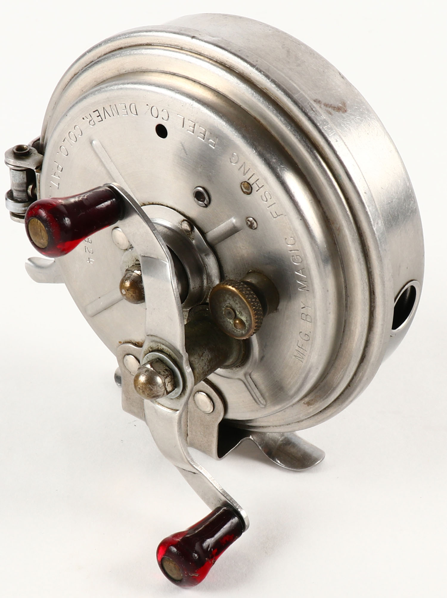 Magic Fishing Reel No 16102, Denver CO, dual red handles, works well. Grade: Excellent - Value: 10 to 50