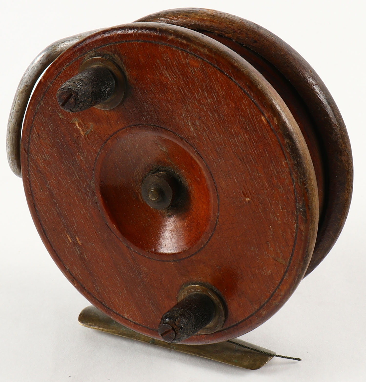 | Unmarked wood/brass fly reel, English circa 1890's, dual handle...
