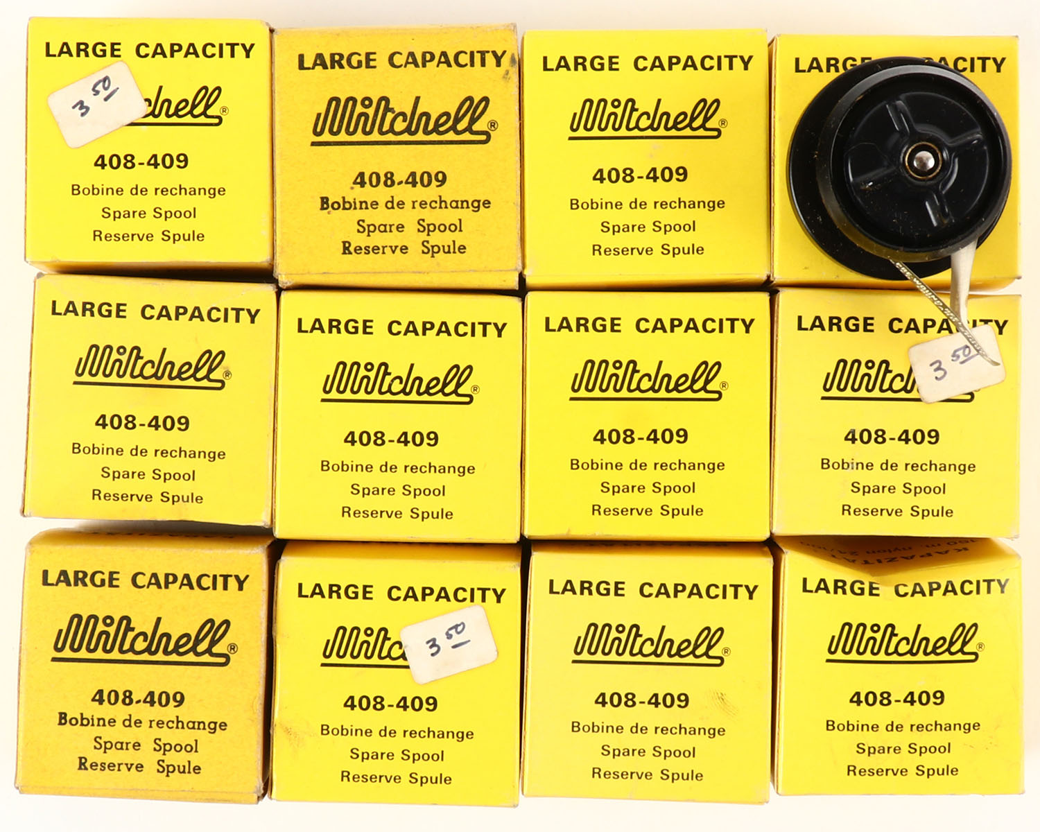 Large lot of Mitchell Garcia spools in original boxes, all are for smaller reels like the 408-409. Grade: Excellent ++ - Value: 10 to 100