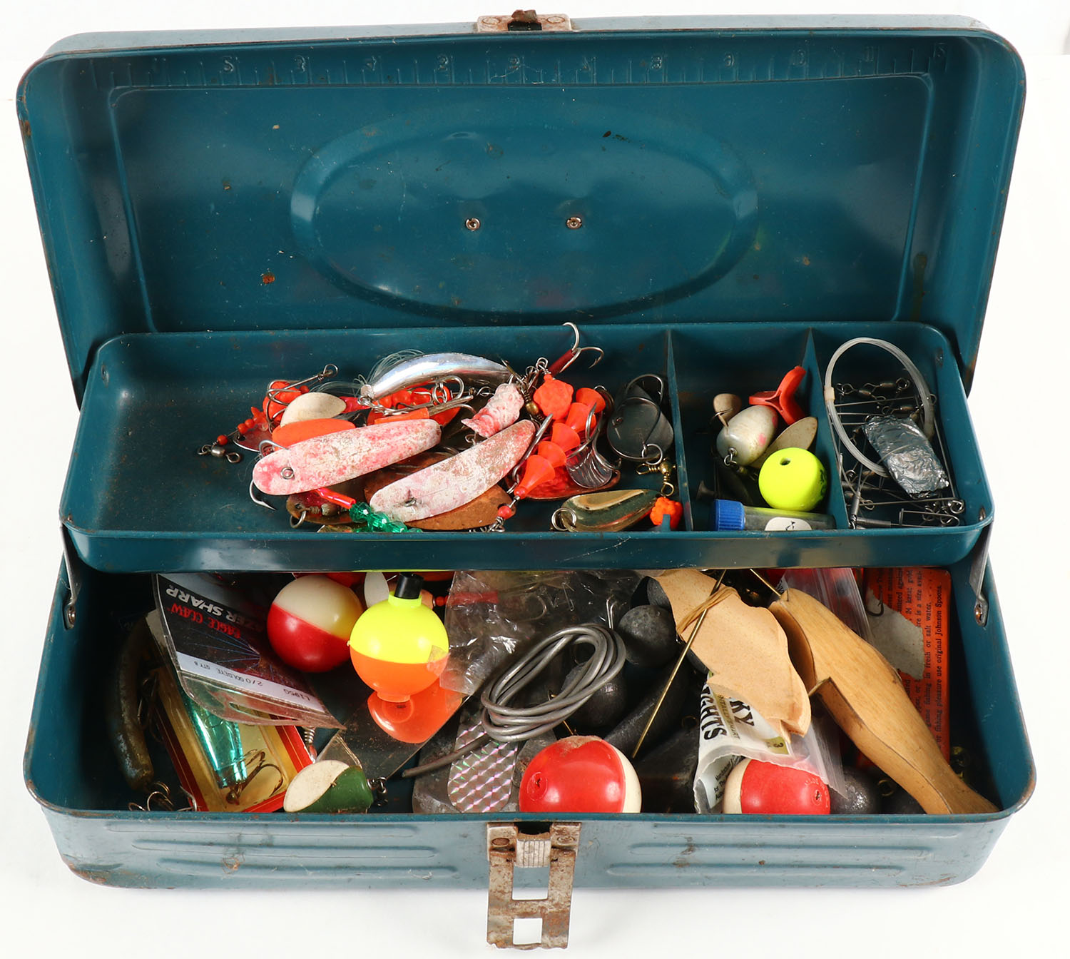 Montgomery Ward's Fishing Tackle box full of lures & gear, latch is broken. Grade: Very Good - Value: 6 to 30