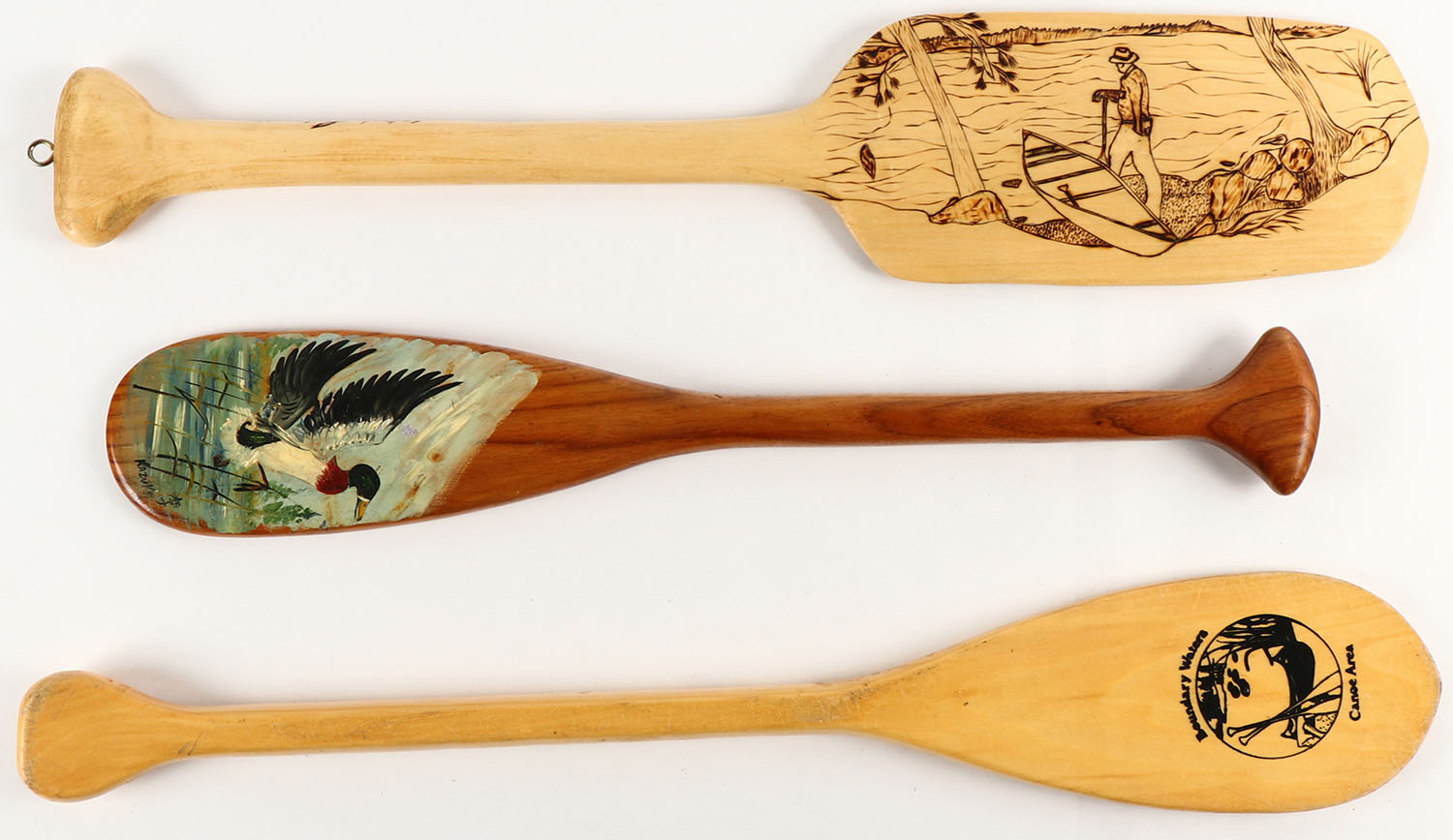 Lot of 3 salesman sample small canoe paddles, 23'' on the longest one. Grade: Excellent - Value: 20 to 100