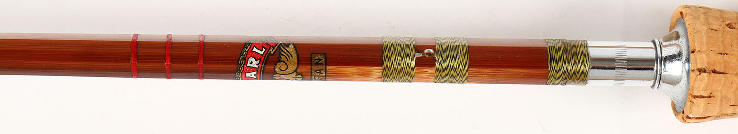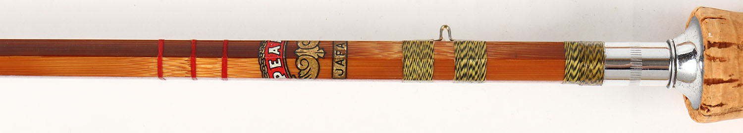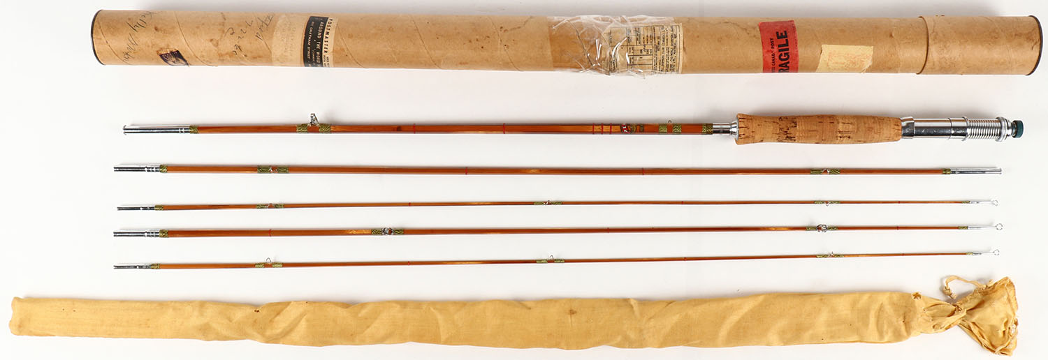 Pearl Japan, Bamboo Combo Fly/Spinning Rod, Fly is 8', 4wt, 3/2, spinning is 8', 3/1, rod is very nice with wonderful wraps, cork is very nice and maybe unfished, unmarked cardboard tube & cloth bag. Grade: Excellent - Value: 50 to 250