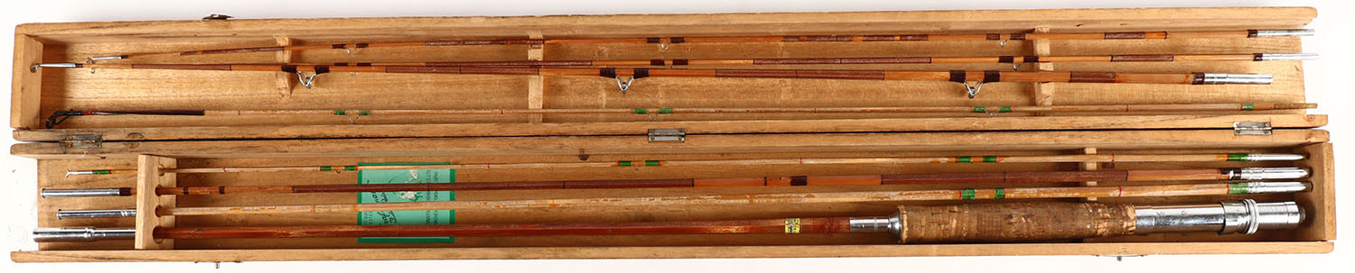 Grampus Japan, Bamboo Combo Fly/Spinning Rod, rod is mismatched with 8 pieces total, some to not match, unmarked wood box. Grade: Good - Value: 2 to 10