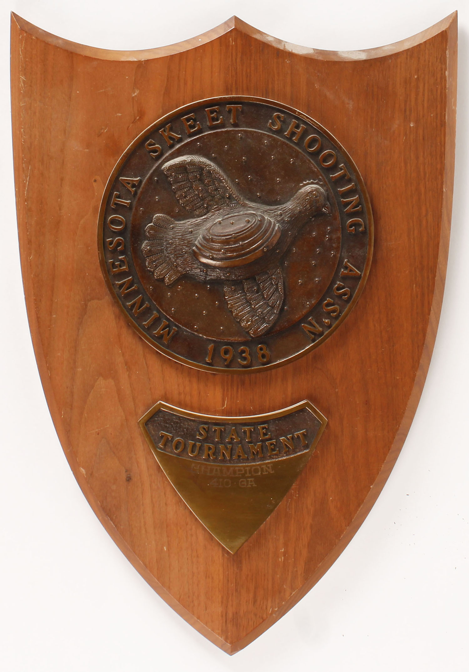1938 Minnesota Skeet Shooting Ass'n heavy brass plaque/trophy, State Tournament, Champion .410 GA, mounted on wood base, 12'' x 18 1/2'', pictures the flying quail with clay bird in body with shot all around. Grade: Excellent - Value: 100 to 500