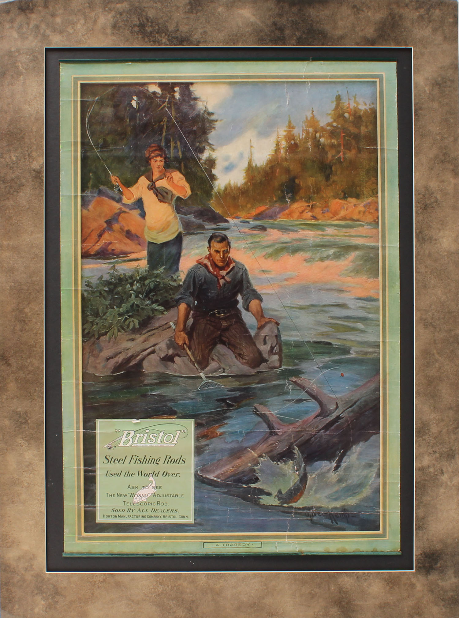 RARE 1911 BRISTOL Calendar, ''A TRAGEDY'' ''BRISTOL STEEL RODS USED THE WORLD OVER'', pictures wonderful full colored image of woman landing a brook trout and snagged on a log with a cowboy to her rescue, ''Horton MFG Co.'', has metal bands top or bottom, no pages, 17 1/4'' x 25 1/2'', is glued down to matt, shows roll wrinkles & light scuffing otherwise very nice, matted. Grade: Very Good + - Value: 1000 to 3000