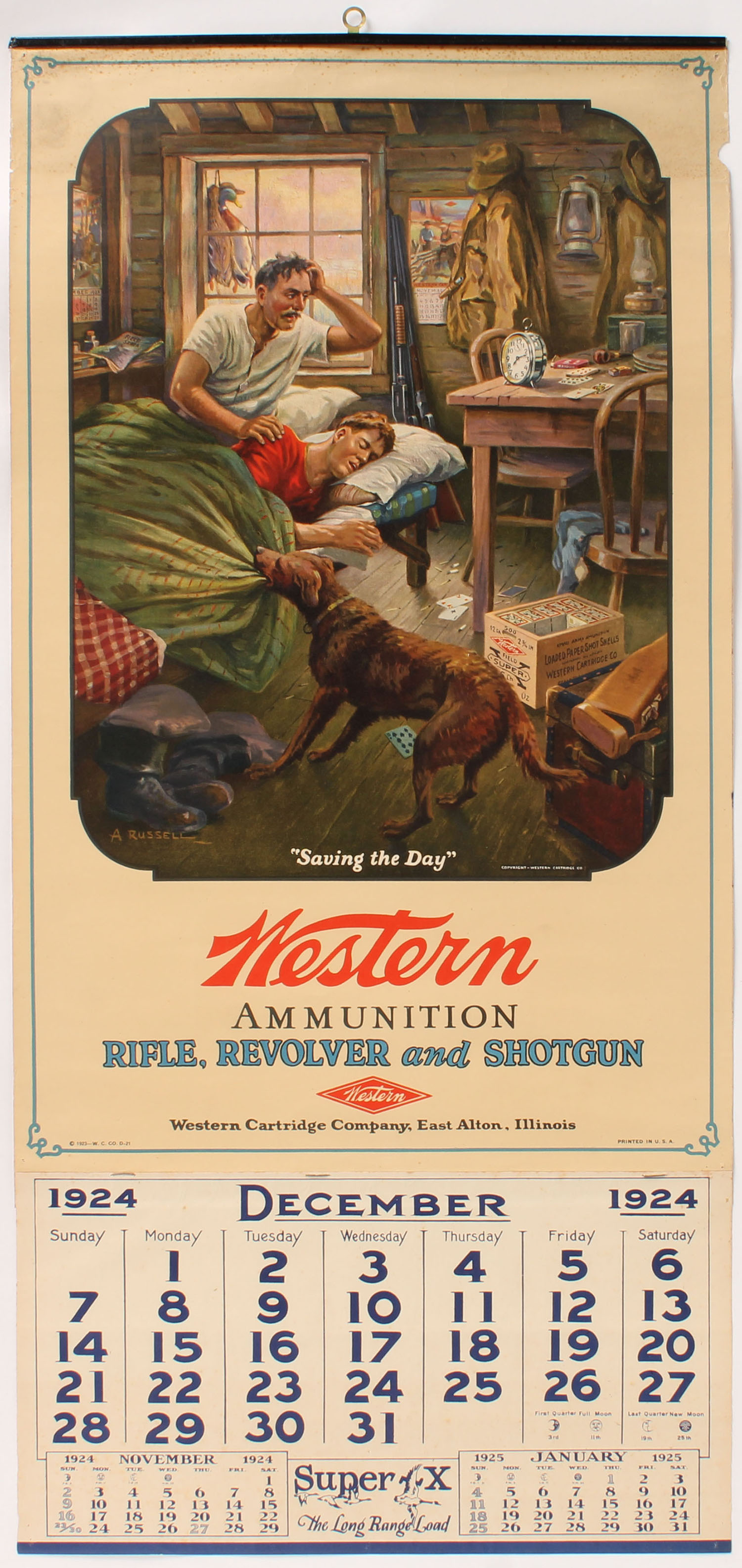 1924 Western Calendar, by A. Russell, ''SAVING THE DAY'', pictures dog waking up the hunters as they sleep in, also mallards hanging in the background with shotguns & a crate full of 2pc shotshell boxes, has fantastic colors with very light edge wear, metal band at top with brass hanger, Dec. Page, 14 3/4'' x 31''. Grade: Excellent - Value: 500 to 1000