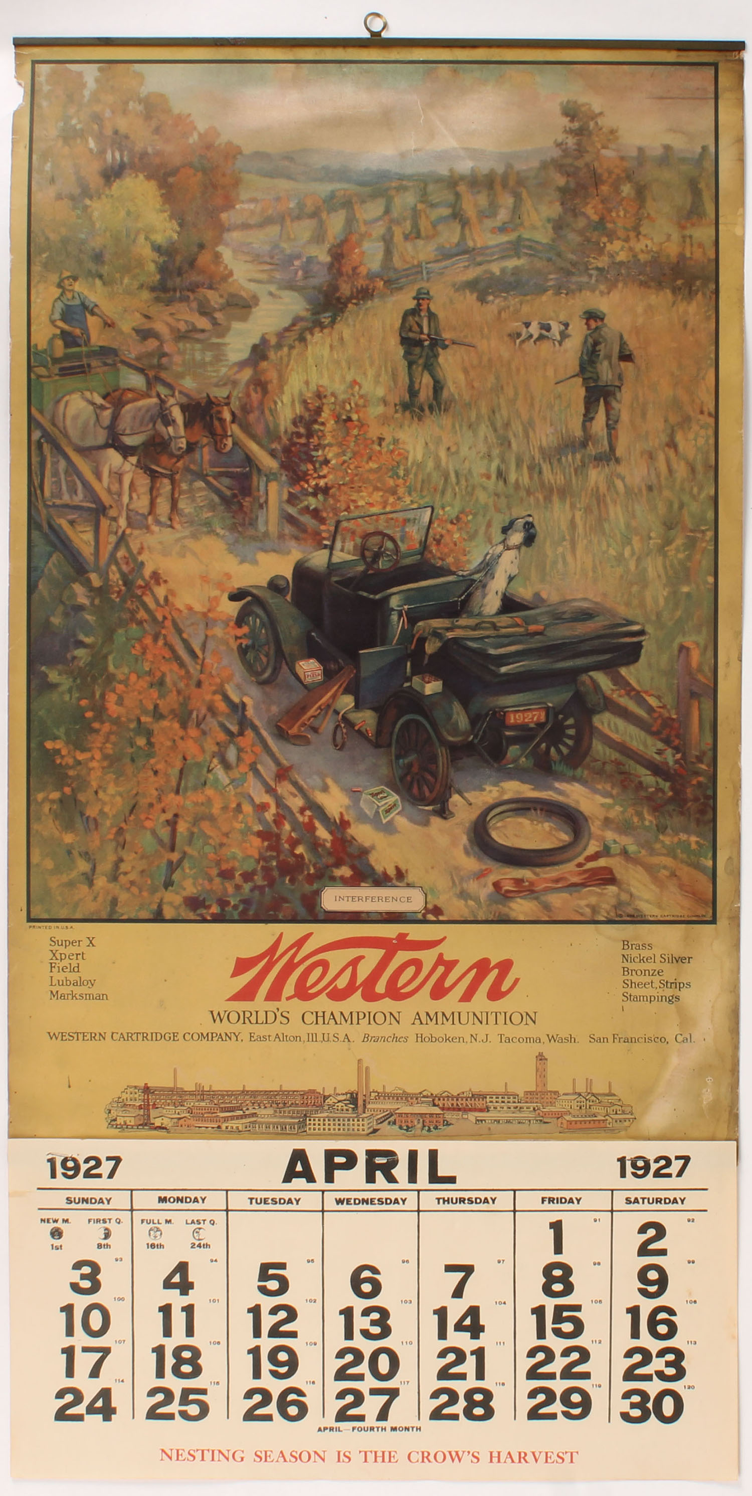 1927 Western Calendar, ''INTERFERENCE'', pictures hunters afield hunting & the car broke down in the middle of the road blocking the farmer on the bridge, shows nice colors with some stains, nice edges, has metal band on top with brass hanger, April Page, 15'' x 29 1/2. Grade: Very Good + - Value: 300 to 600