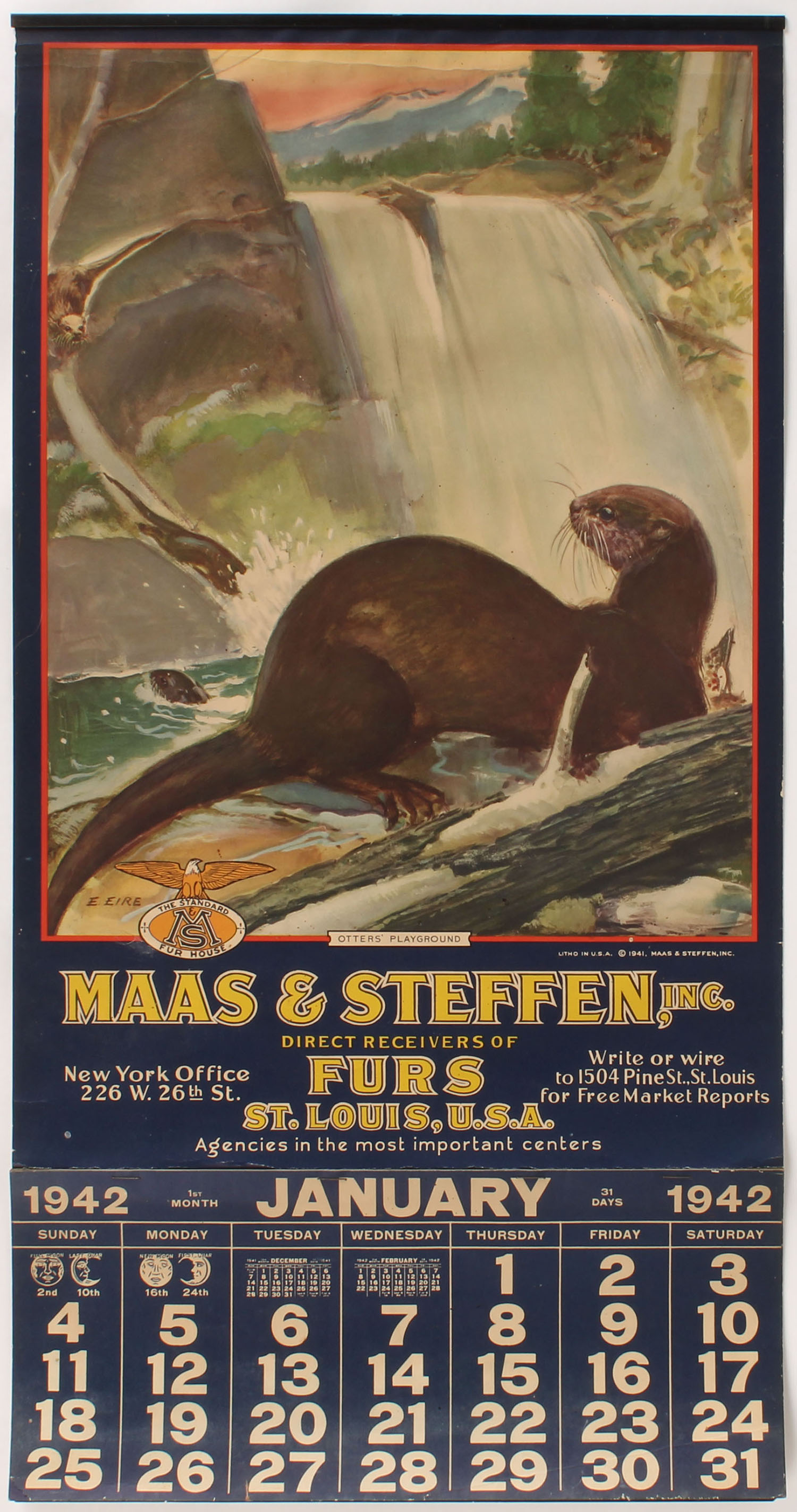Maas & Steffen 1942 Calendar, ''OTTERS' PLAYGROUND'', pictures otters playing in waterfall/pond, 13 1/2'' x 27'', has original band with hanger, shows some light edge wear, Full Pad of Pages, has great color with beautiful image. Grade: Excellent ++ - Value: 600 to 1200