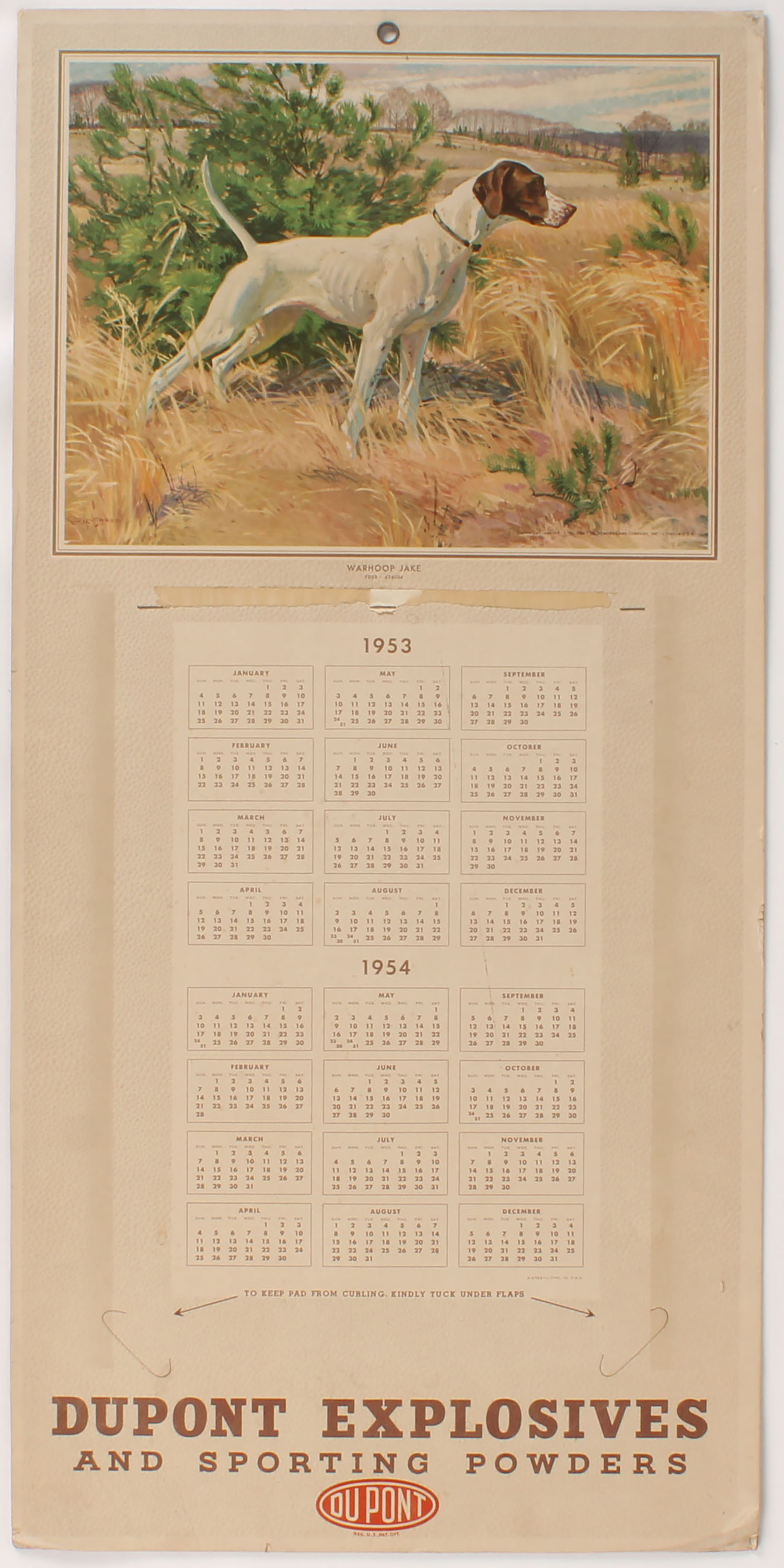 1953 Dupont Powder Co. Calendar, ''WARHOOP JAKE'', 15'' x 31'', great full color image of German Shorthair on point, brass eyelet, no pages, calendar is near mint with great colors. Grade: Excellent + - Value: 40 to 300