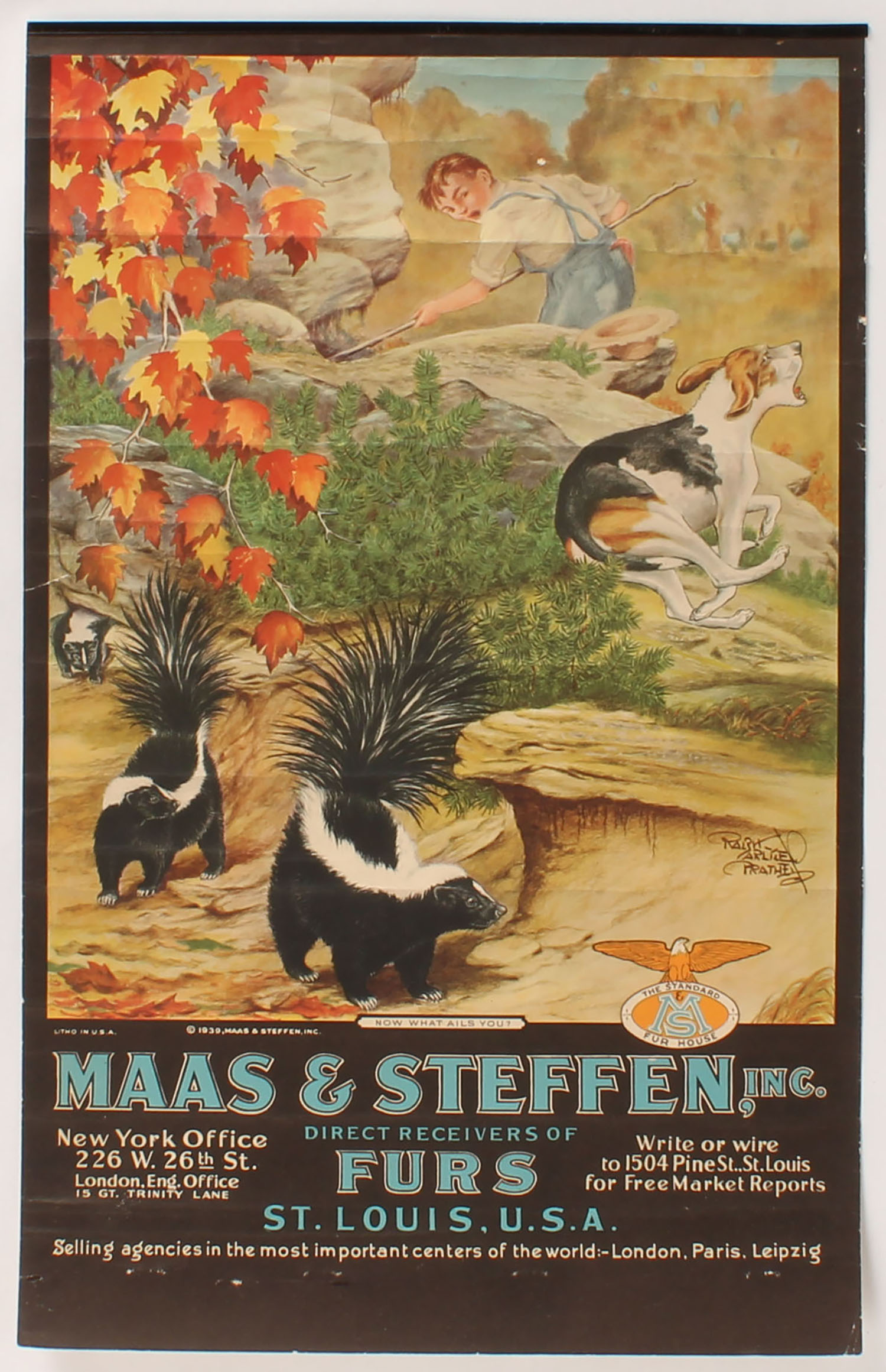 1940 Maas & Steffen Calendar top, ''NOW WHAT ALIS YOU?'', pictures skunks spraying a beagle & a young boy in the woods, 13 1/2'' x 21 1/2'', has original band with brass hanger, shows very light edge wear & roll wrinkles, no pages, has very nice color with beautiful image. Grade: Excellent - Value: 30 to 100