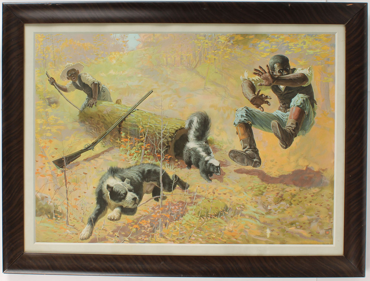 RARE Winchester Poster ''SHOOT THEM AND AVOID TROUBLE'', this highly controversial original poster does not include the rare frame-like boarder around image, released to stores in 1908, the ambiguous interpretation of the ''SHOOT THEM'' advice caused Winchester to recall the posters and trim off the outside ''frame'' portion, 29'' x 21'', has vivid image of two hunters & dog confronting a skunk in the woods, edges are nice & the color is near mint, framed, this is the trimmed variation. Grade: Excellent ++ - Value: 200 to 2000