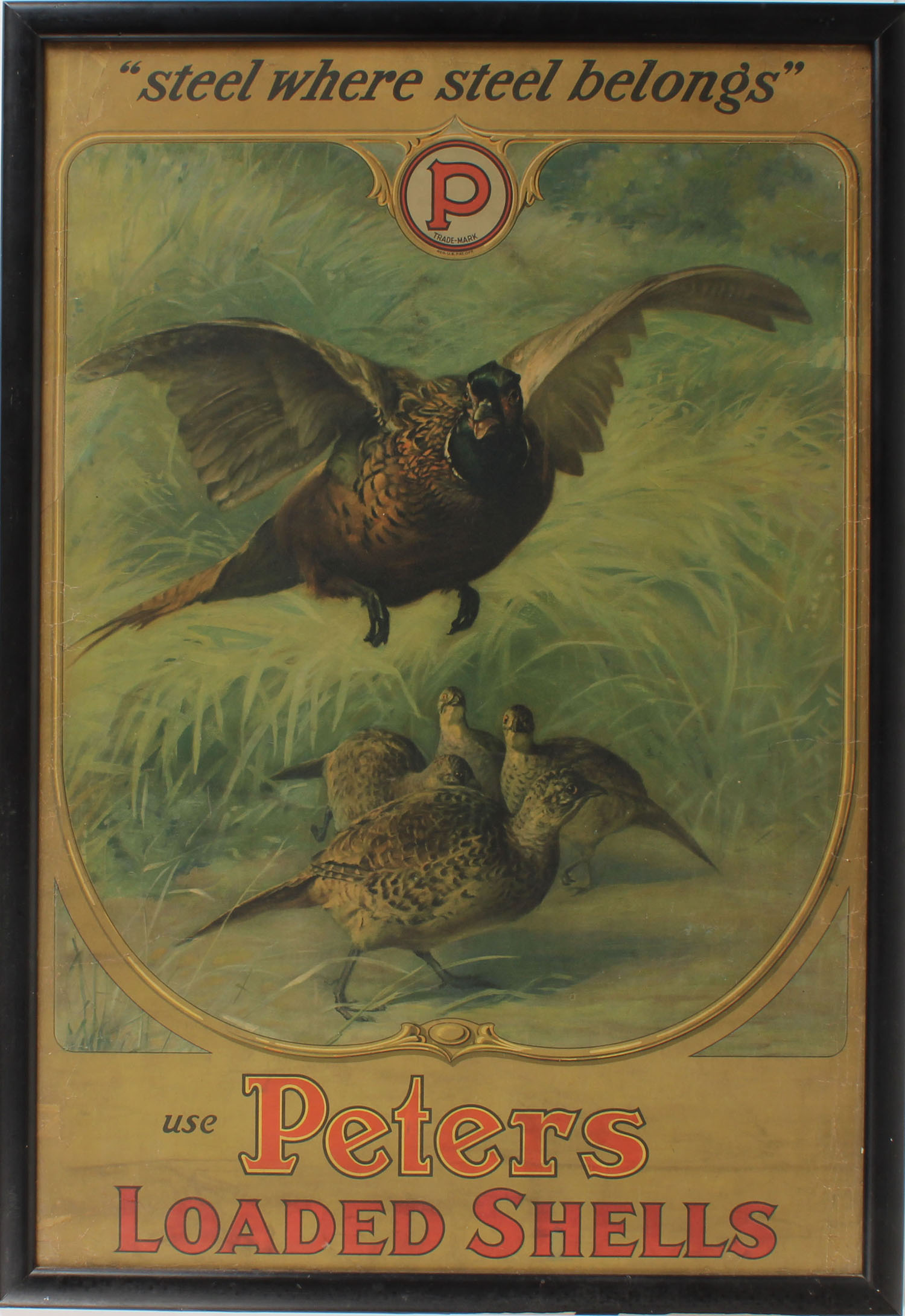 Peters ''STEEL WHERE STEEL BELONGS'' ''USE PETERS LOADED SHELLS'', poster, pictures pheasants in grass, shows edge wear & age soiling, no bands, 20 1/4'' x 29 1/2'', framed. Grade: Very Good ++ - Value: 500 to 1000