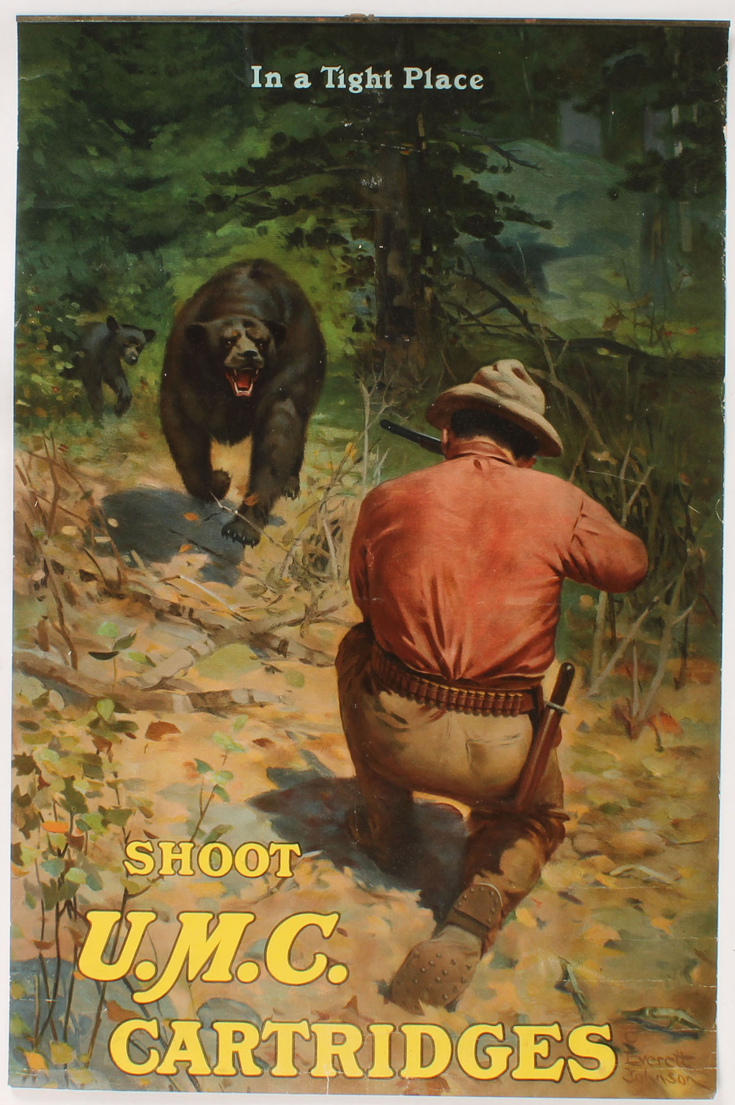 UMC Poster ''IN A TIGHT PLACE'', pictures hunter aiming at a charging black bear with cubs, ''SHOOT U.M.C. CARTRIDGES'', by Everett Johnson, has metal band on top with no hanger, light edge wear otherwise great colors, 16'' x 24 1/4''. Grade: Excellent - Value: 800 to 2000