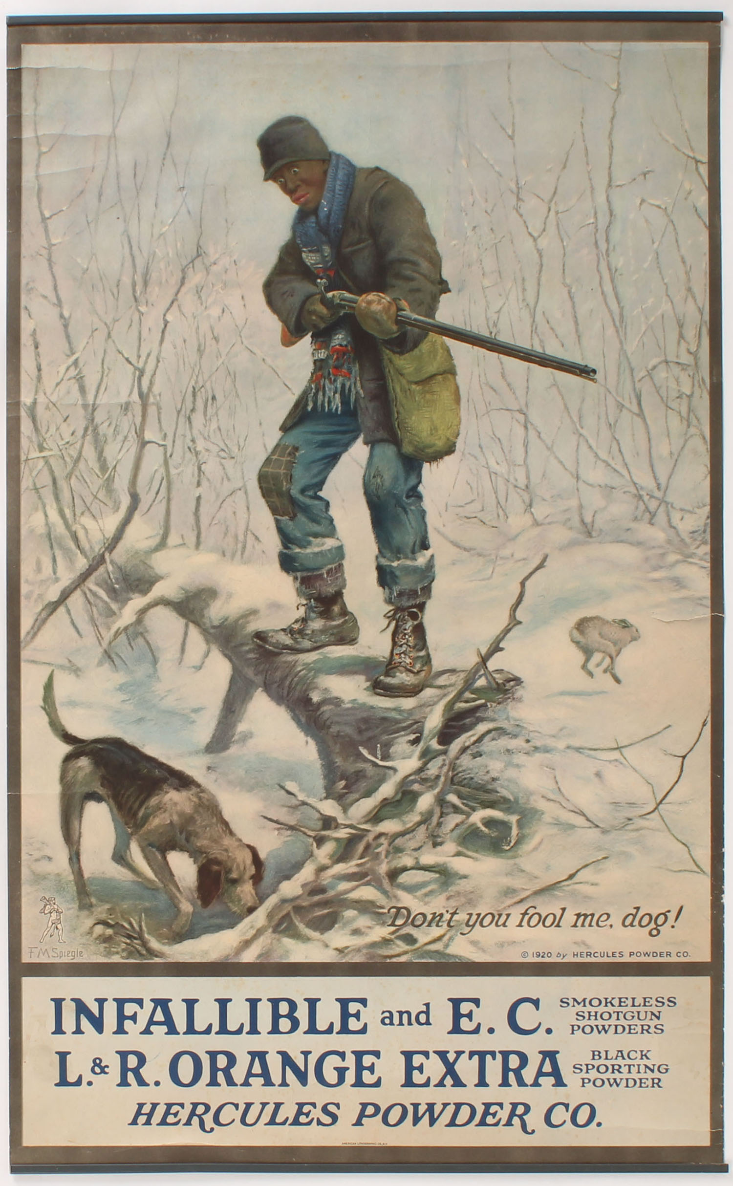 Hercules Powder Co. Poster, ''DON'T YOU FOOL ME. DOG!, DATES 1920, pictures two hunters in snow scene with black powder shotgun & dog with rabbit running away behind them, by F.M. Spiegle, has metal bands top & bottom with brass hanger, has nice colors with light roll wrinkles and one edge tear, 15 1/2'' x 25''. Grade: Excellent + - Value: 500 to 1000