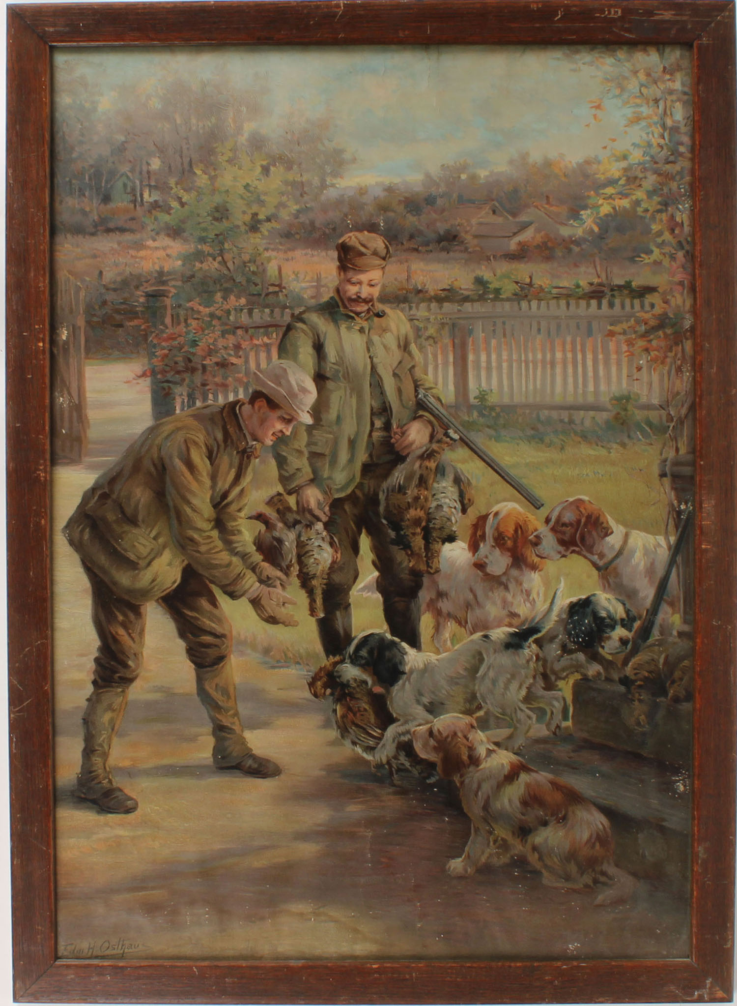Edmund Osthaus poster pictures two grouse hunters with many dogs & a double shotgun, shows some scuffing with great colors, framed, 21'' x 30''. Grade: Very Good ++ - Value: 100 to 800