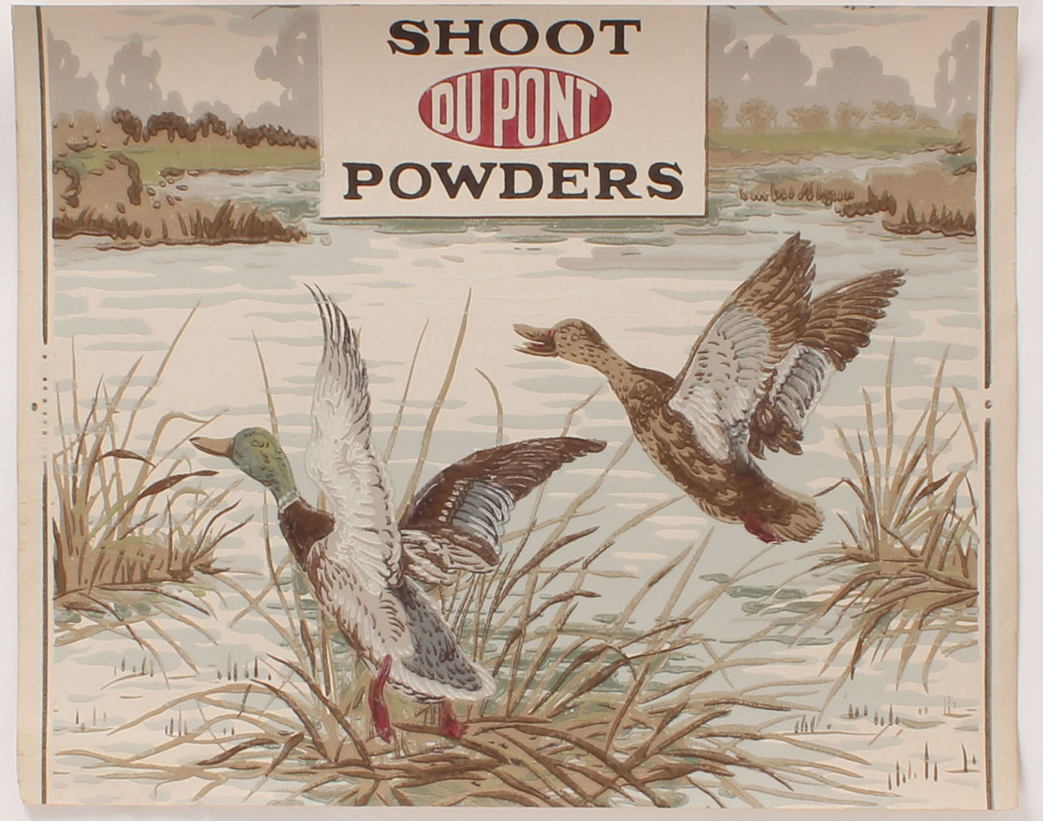 Shoot Dupont Powders Poster, pictures mallard in flight, 19 1/2'' x 16 1/2''. Grade: Excellent - Value: 20 to 200