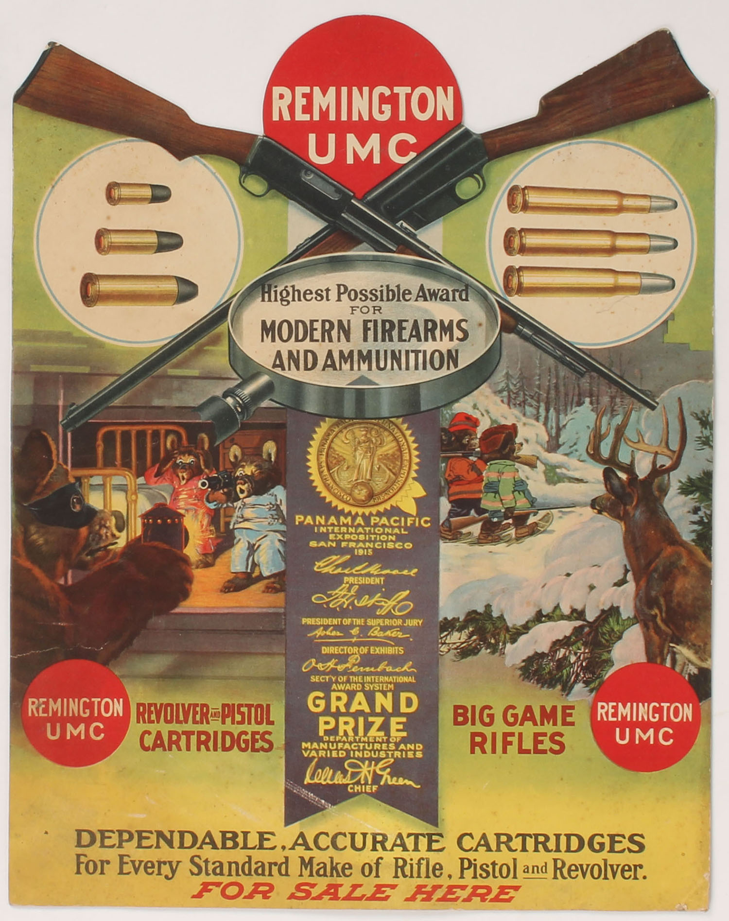 Remington UMC Diecut, Pictures the Rem Bears in two different scenes, promoting Panama Pacific Grand Prize, also pictures deer, crossed guns (model 8 & 14 plus ammo, fantastic colors, has easel back, 11'' x 14''. Grade: Excellent ++ - Value: 200 to 600
