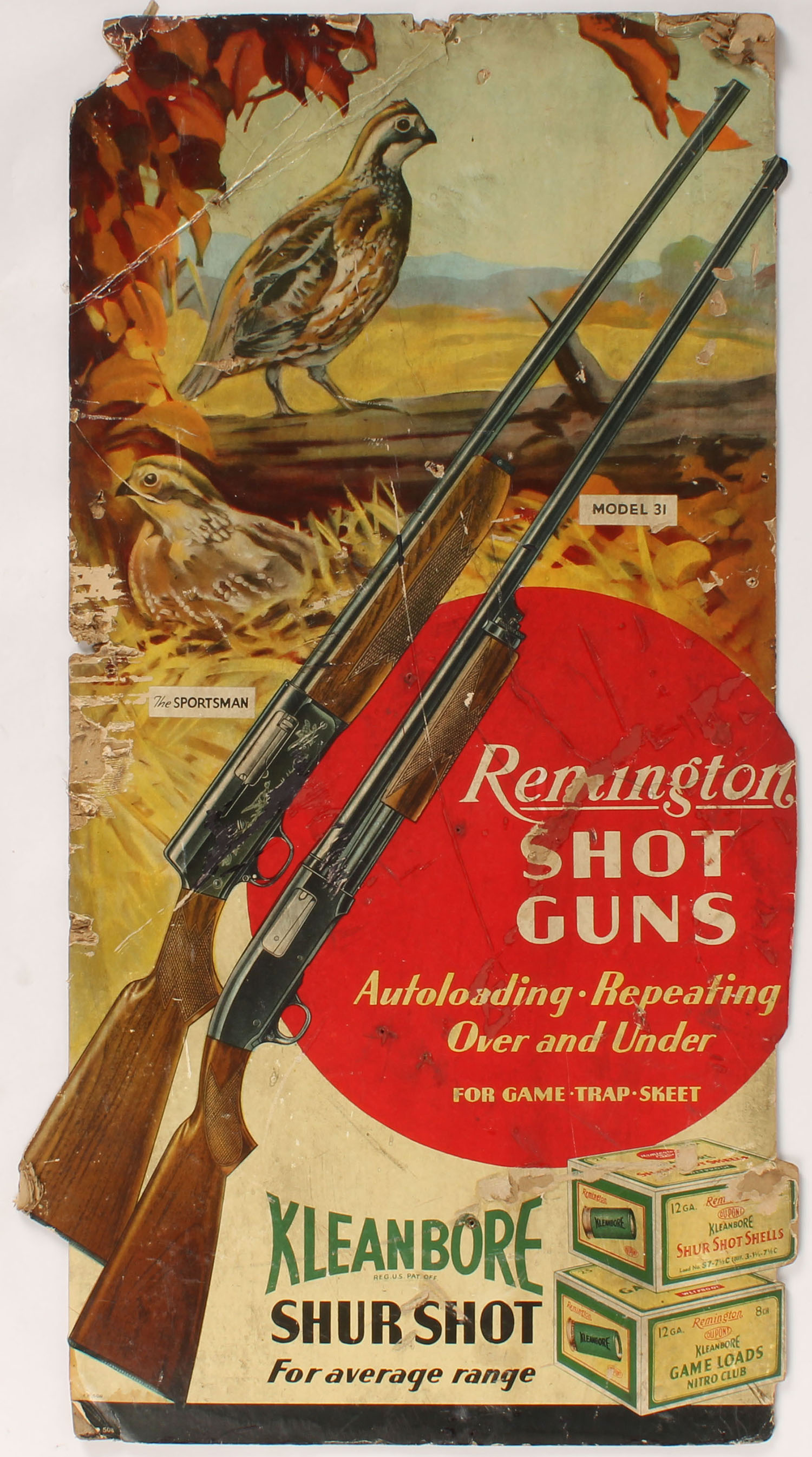Remington Diecut, pictures quail hunting scene with model The Sportsman & 31 shotguns, plus shell boxes, shows wear & soiling, 15 1/2'' x 29''. Grade: Good ++ - Value: 50 to 500