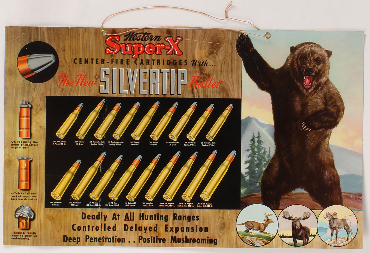 Western Super-X SILVERTIP diecut, pictures standing bear, deer, moose, ram & many cartridges for big game, has red hang string, 21'' x 13''. Grade: Excellent ++ - Value: 50 to 300