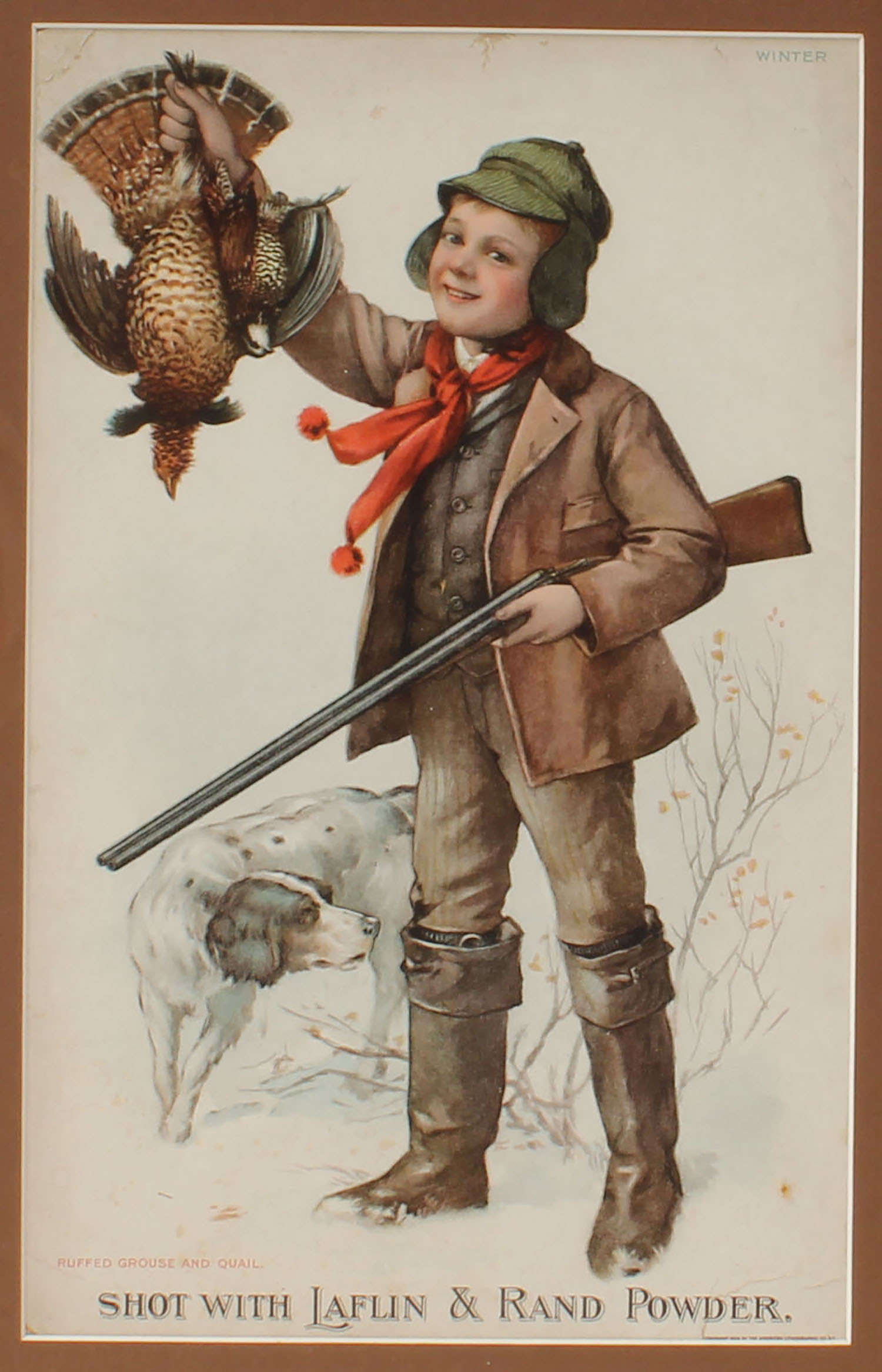 Laflin & Rand Diecut, pictures young boy with shotgun, his dog & a ruffed grouse & Quail in snow scene, marked Winter', framed, 8'' x 12''. Grade: Excellent - Value: 50 to 100