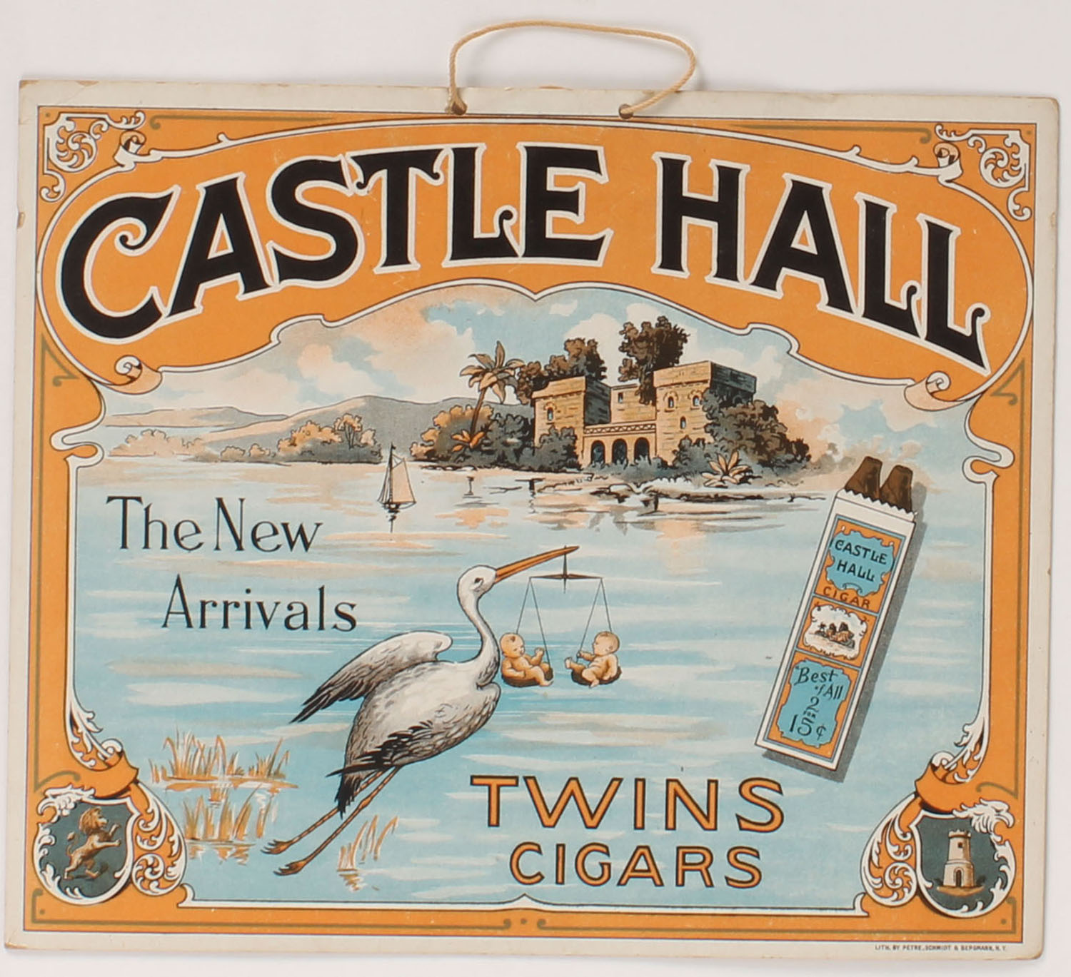 Castle Hall Twin Cigars advertising cardboard sign, has original hang string, pictures stork with twin babies fling over lake, 12'' x 10''. Grade: Excellent - Value: 50 to 300