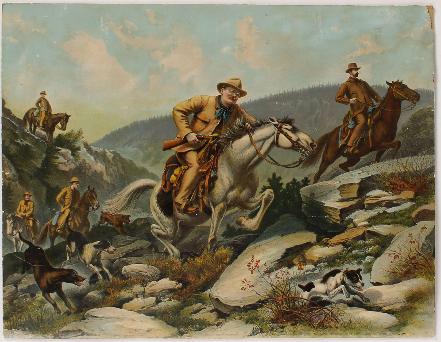 1905 Theodor Roosevelt cardboard diecut, pictures him on horse back bear hunting, ''THE TRACK'', has great colors with many dogs & hunters on horseback, 19 1/2' x 15''. Grade: Excellent - Value: 30 to 200