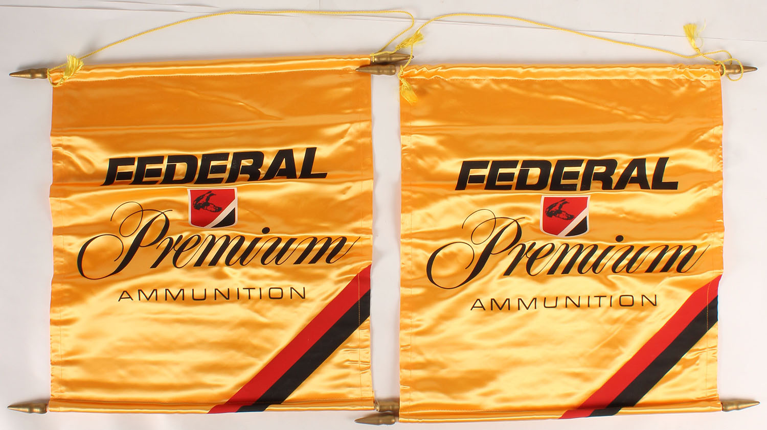 Lot of 2 Federal banner, ''FEDERAL PREMIUM AMMUNITION'', gold, red & black, all complete, 20'' x 23''. Grade: MINT - Value: 60 to 150