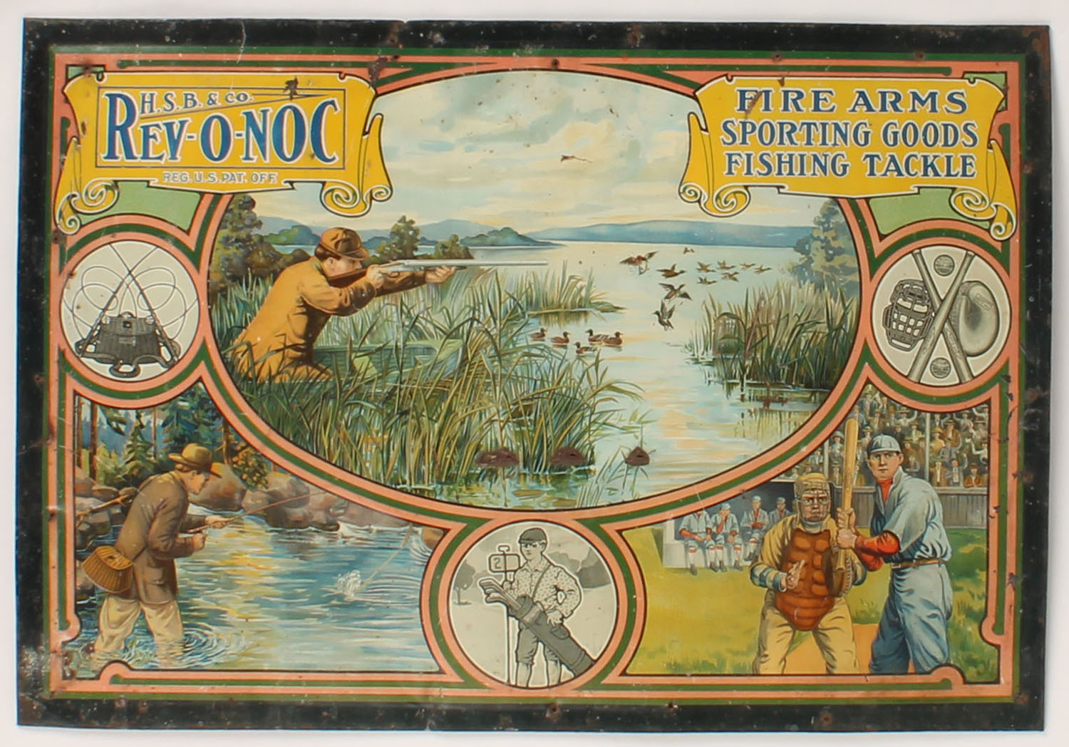 Hibbard, Spencer, Bartlett & Co. metal advertising sign, ''FIRE ARMS SPORTING GOODS, FISHING TACKLE'', has many images of hunting, fishing, golf & baseball, shows some edge wear with holes, nice colors, 19'' x 13 1/4''. Grade: Very Good - Value: 10 to 200