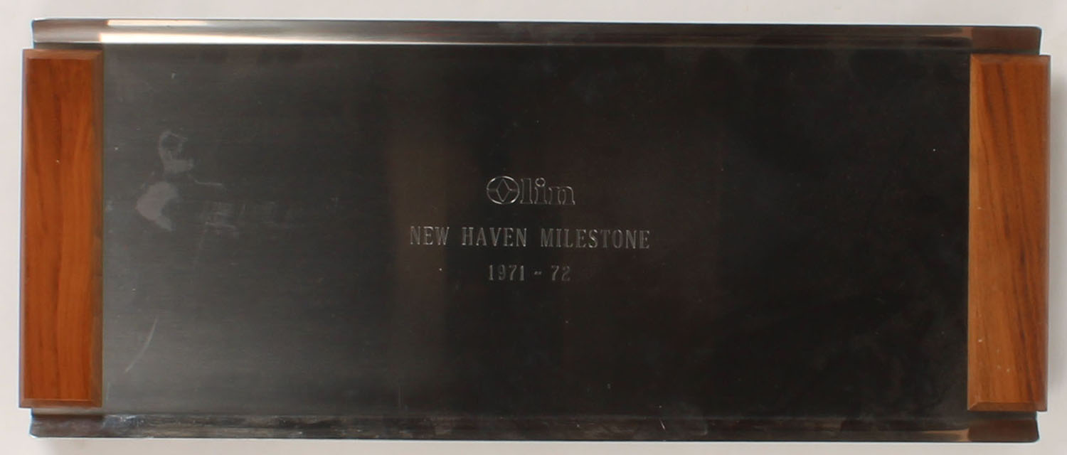 1971-72 ''Olin New Haven Milestone'' metal serving tray with wood handles, 21'' wide. Grade: MINT - Value: 30 to 150