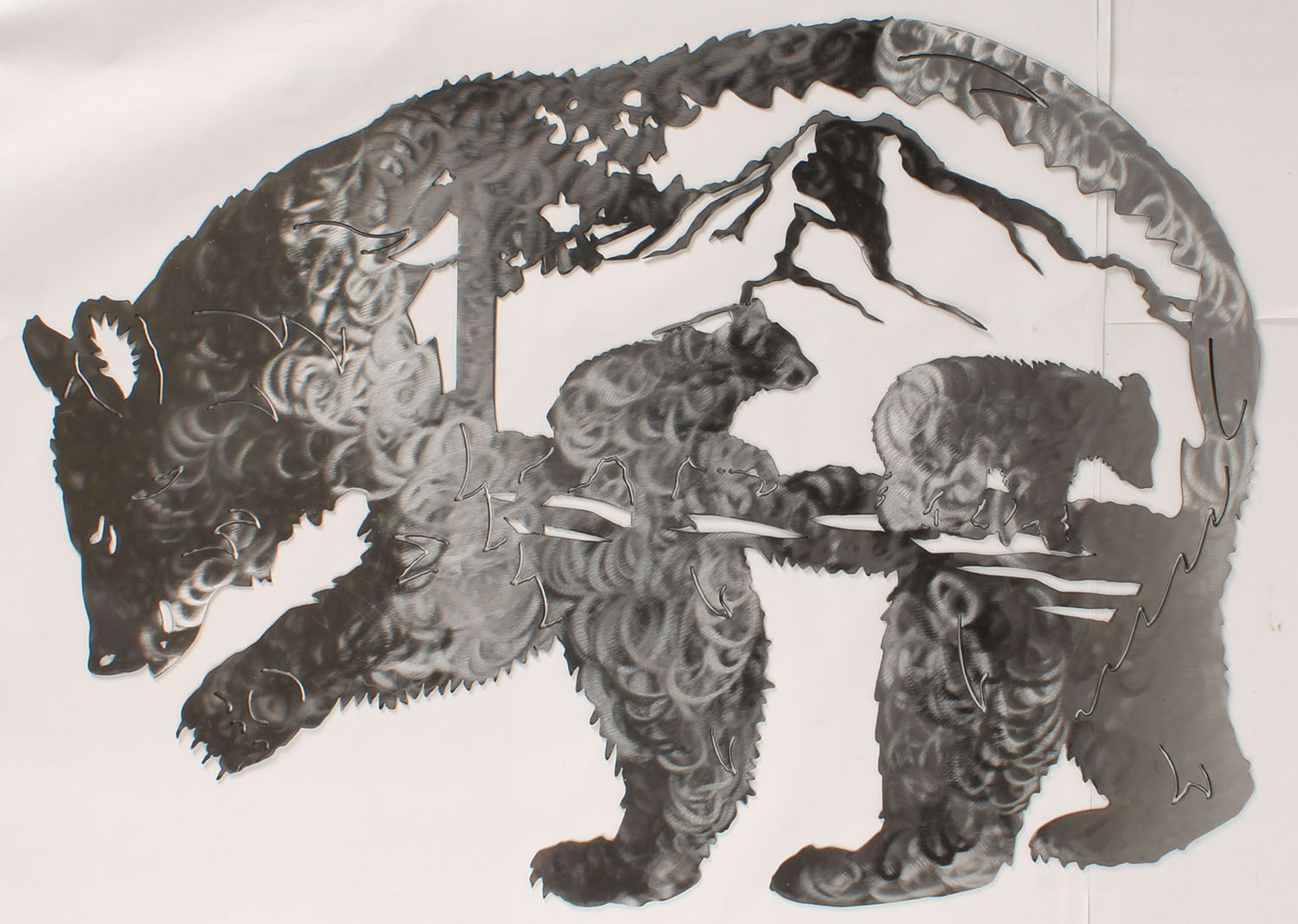 Heavy metal cut into the shape of a bear with cubs & mountains in the center, 36'' wide. Grade: MINT - Value: 40 to 250
