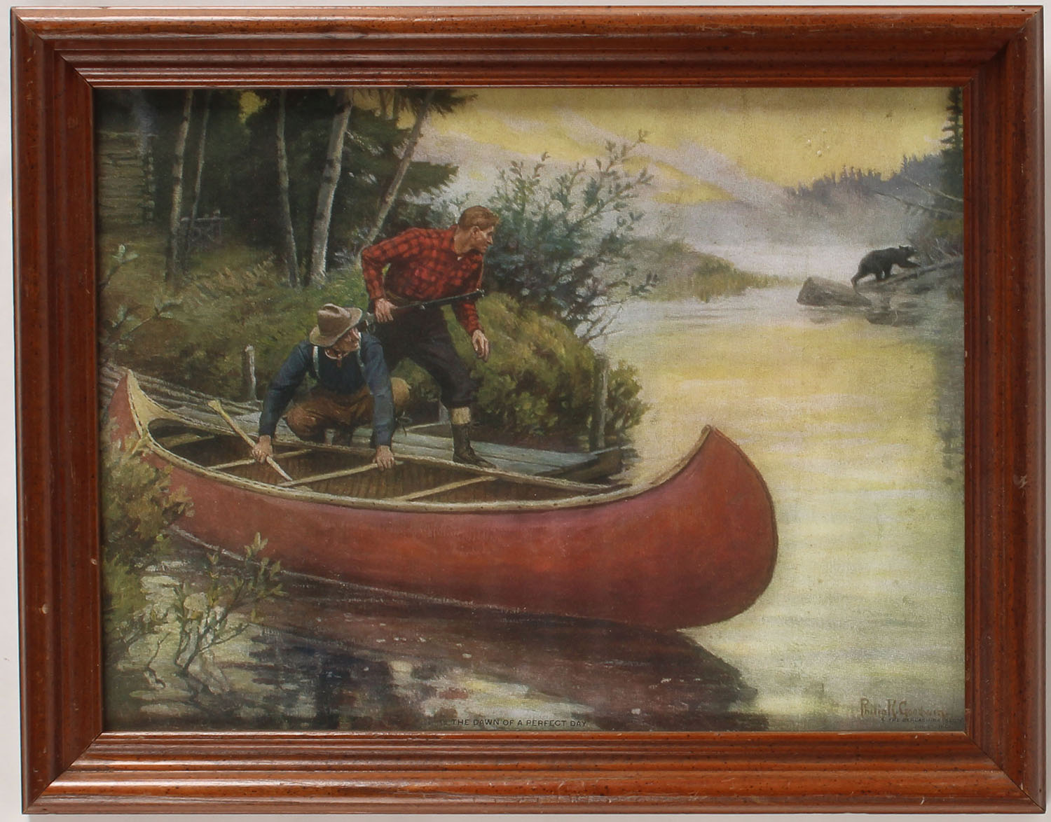 Philip R. Goodwin print, ''THE DAWN OF A PERFECT DAY'', nice full color image of hunters in canoe with grizzly bear on the other side of the river, image size 14'' x 10 1/2''. Grade: Excellent - Value: 20 to 100