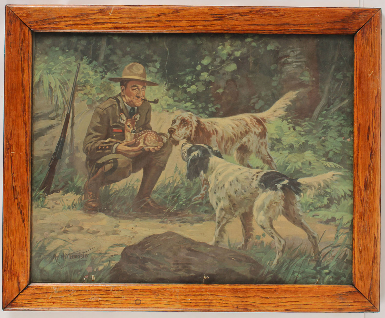 Hy Hintermeister print pictures solider holding a fawn deer with his two english setters on point, image size 23'' x 18'', framed. Grade: Excellent - Value: 10 to 100