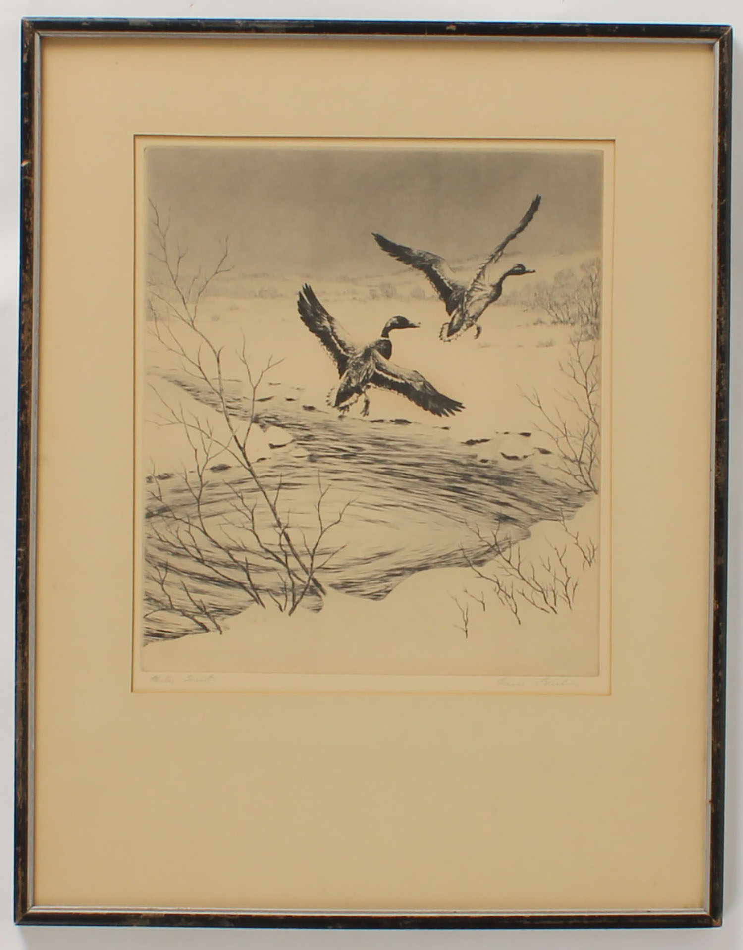 Hans Kleiber etching ''WINTER GUESTS'', pictures mallards near a creek with snow covered fields, image size 9 1/2'' x 11'', framed. Grade: Excellent - Value: 6 to 40