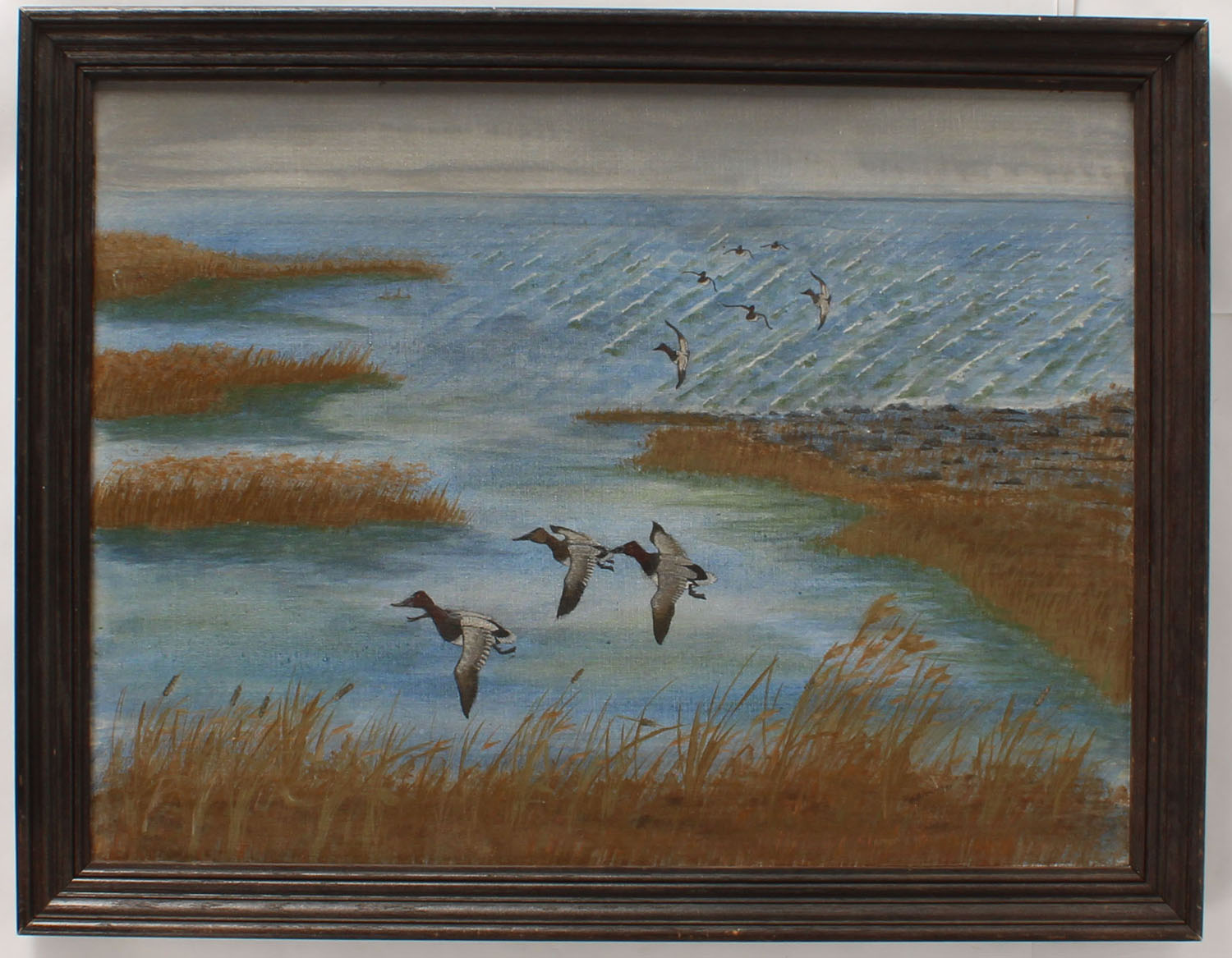 Avie Biedinger original water color, (1924-2017 Cinninnati, OH, pictures canvasbacks in flight, image size 23 1/2 x 18'', framed. Grade: Excellent - Value: 50 to 500