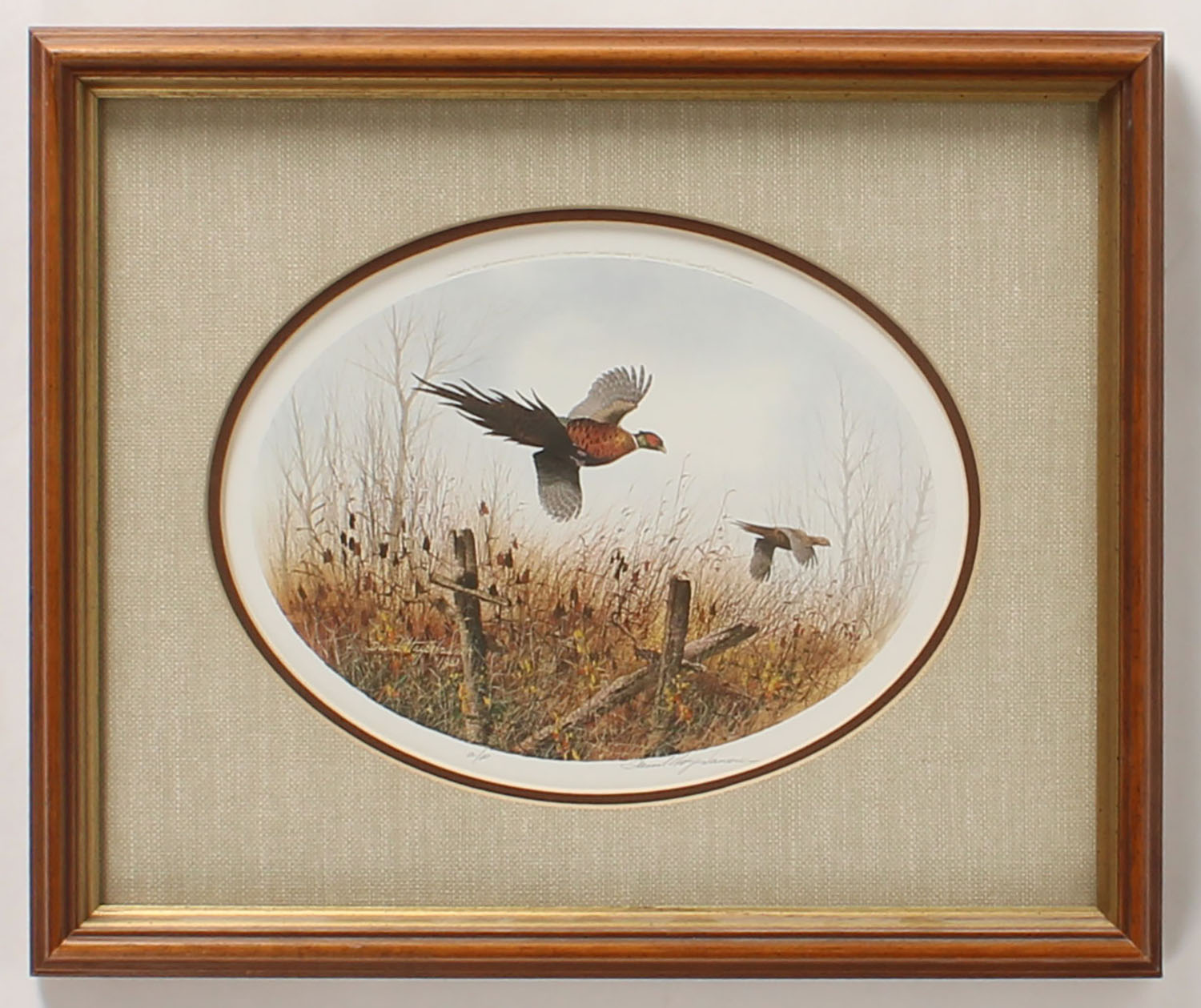 Davis Hagerbaumer Artist proof print, pictures pheasants in flight, image size 9'' x 6 1/2'', framed. Grade: MINT - Value: 20 to 200