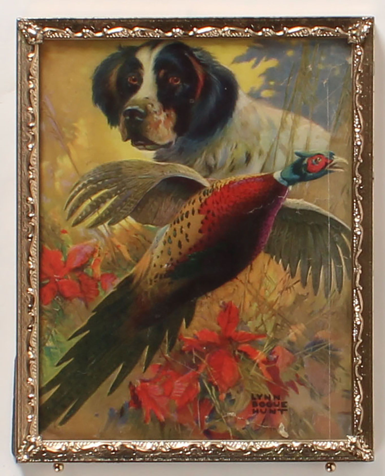 Lynn Bogue Hunt print pictures hunting dog & rooster pheasant, 8'' x 10'', framed. Grade: Very Good - Value: 2 to 40