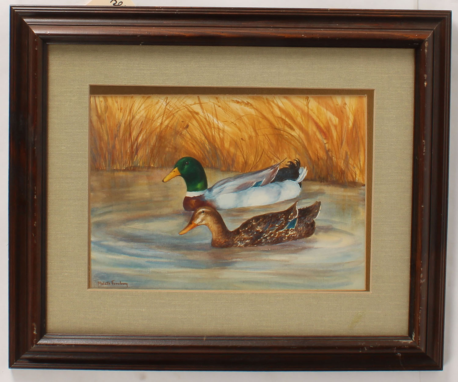 Maleta Forsberg water color, pictures pair of mallards on pond, image size 14 1/2'' x 10 1/2'', framed. Grade: Excellent - Value: 6 to 100