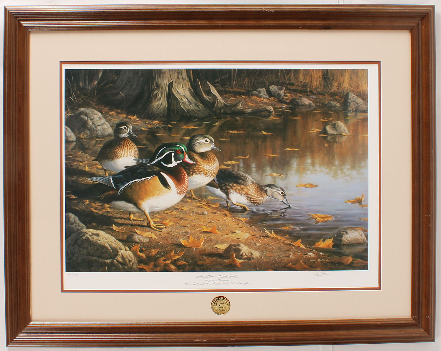 James Hautman print, ''QUIET POOL - WOOD DUCKS'', this is a L.E. 622/5300. image size 24'' X 16'', wonderful full color image of wood ducks are ponds edge, framed & matted with no glass. Grade: MINT - Value: 20 to 100