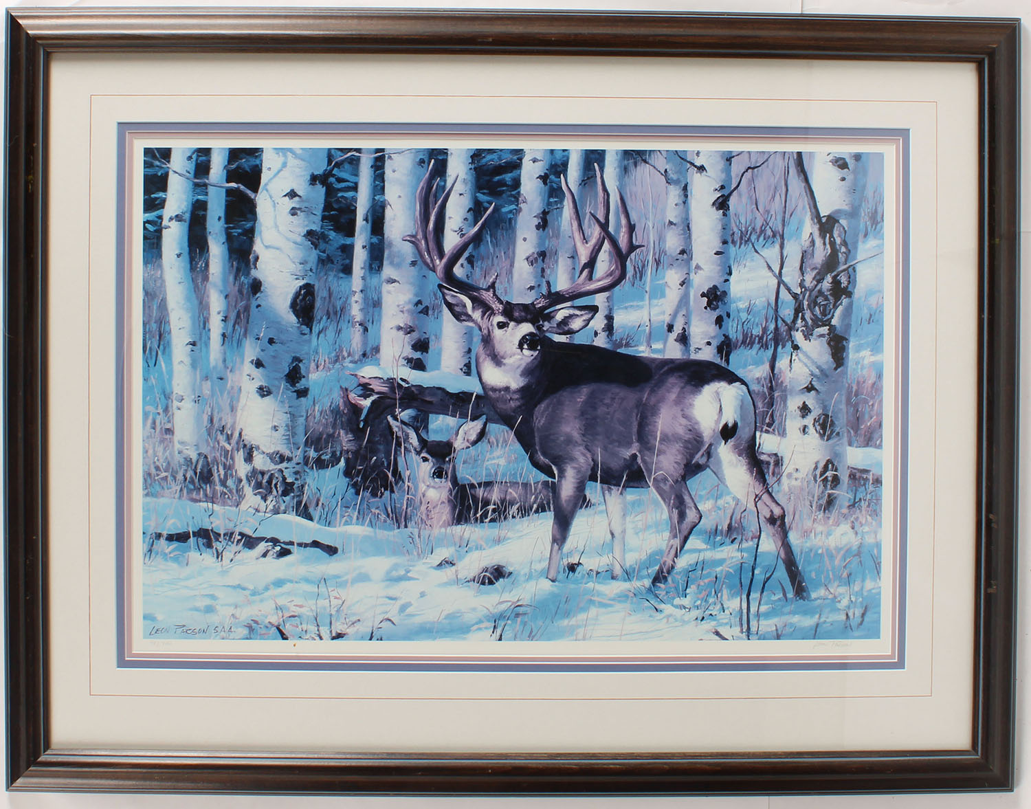 Leon Parson print, this is a L.E. 48/290. image size 28'' X 18'', wonderful full color image of mule deer in snow scene, framed & matted.* Grade: MINT - Value: 20 to 1000