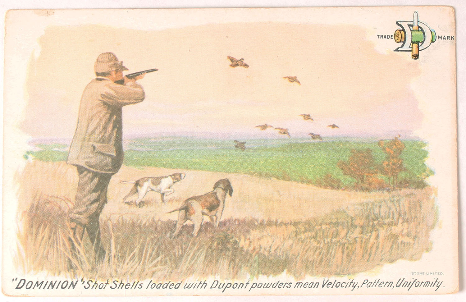 Dominion Cart Co. Postcard, has bent D logo, shows upland bird hunting scene, unused, circa 1913. Grade: Excellent - Value: 20 to 100