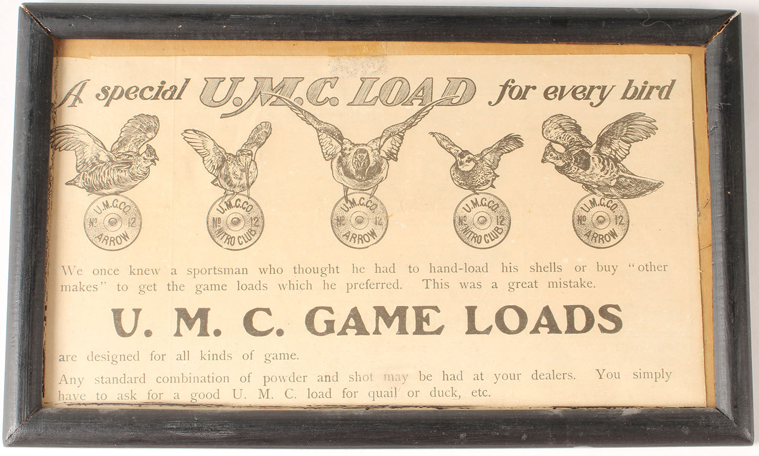 UMC Load paper ad, pictures many game birds & Head Stamps, framed, 10'' wide. Grade: Very Good ++ - Value: 6 to 30