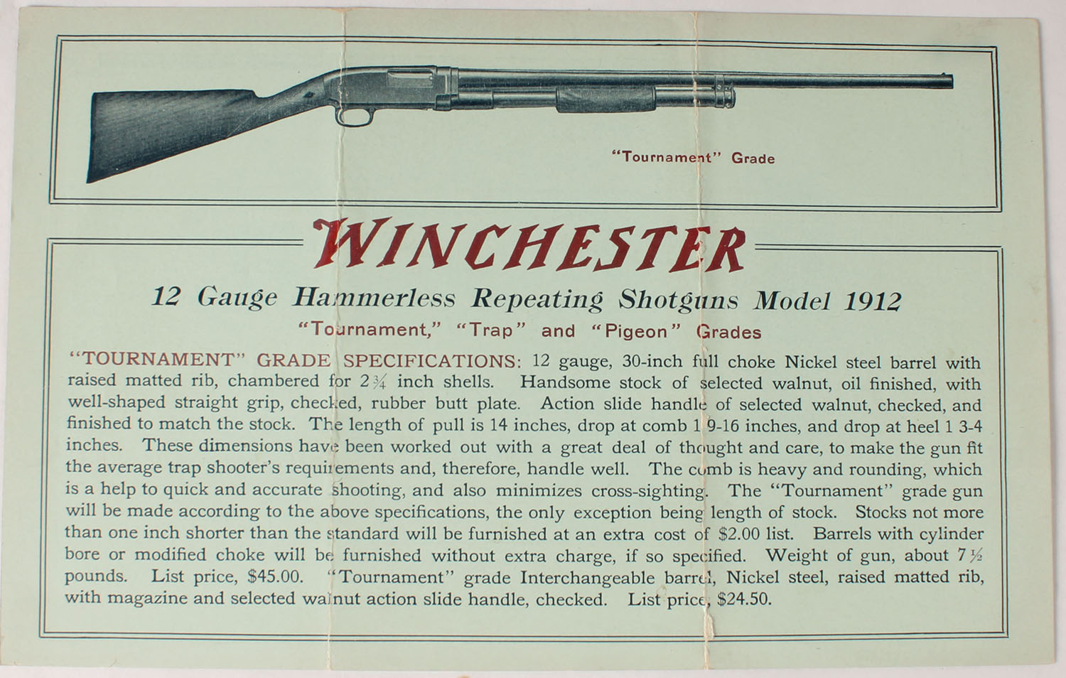 Winchester Model 1912 Trap & Pigeon Grade brochure. Grade: Excellent - Value: 10 to 50