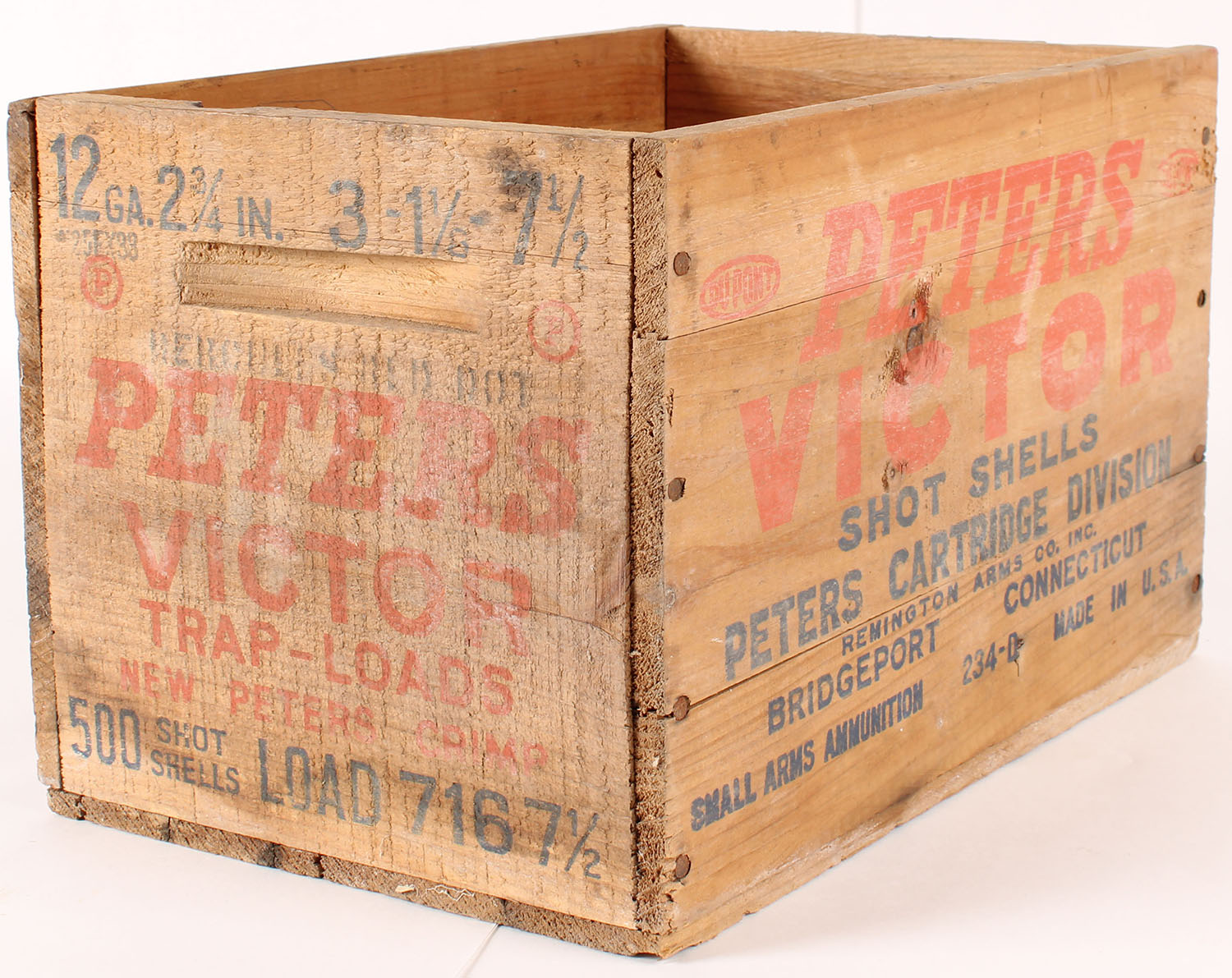 Peters wood shipping crate, Victor Trap Loads, 12 ga., 7 1/2 shot, nail construction, orange & blue print has fading, crate is solid, Grade: Very Good ++ - Value: 20 to 60